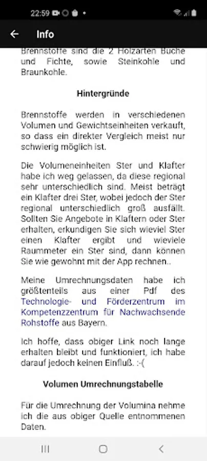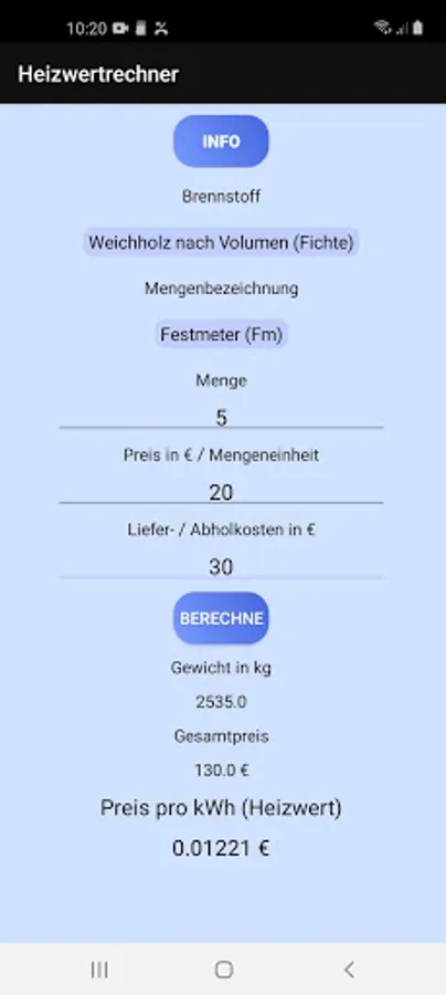 The app calculates the cost per kWh of calorific value for softwood (spruce) and hardwood (beech), as well as lignite or hard coal as fuel. You can either calculate between different volume accounting units or according to weight.