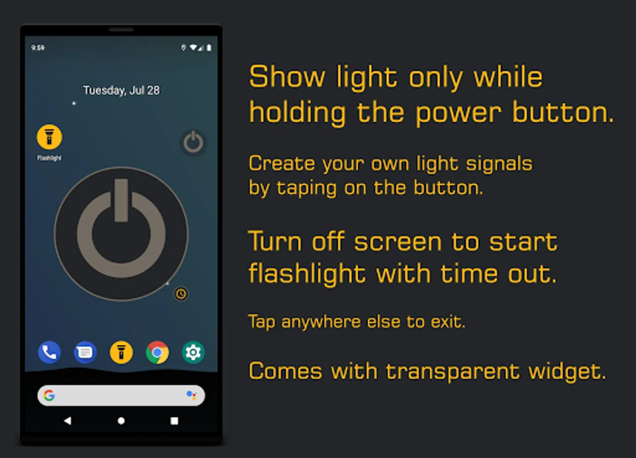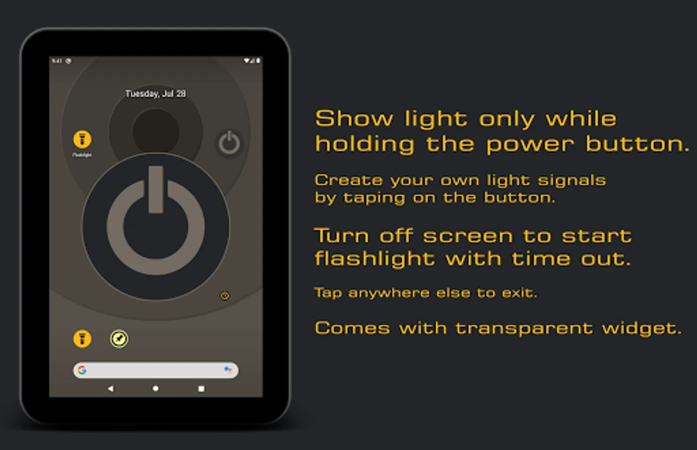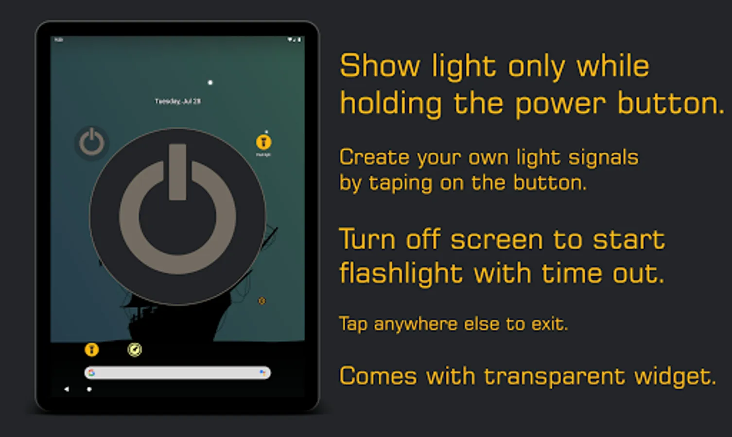 - Show light only while holding the power button. Create your own light signals by taping on the button.