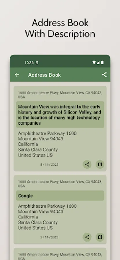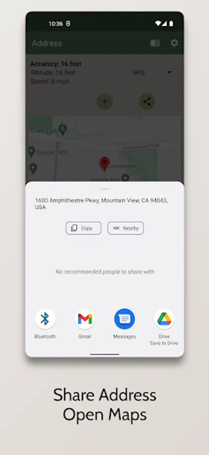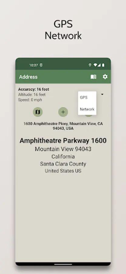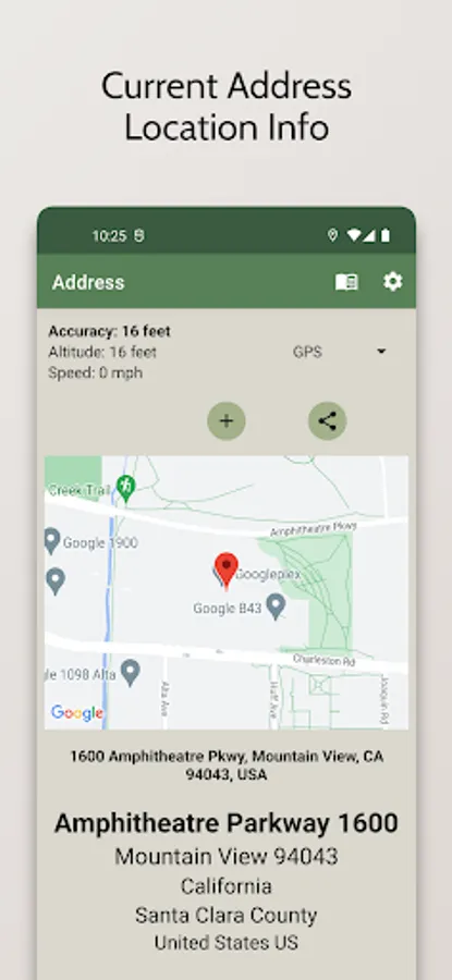 Find current address, street, admin area and country using GPS or Network. Save current location to the address book. Share current address. Open locations in maps.