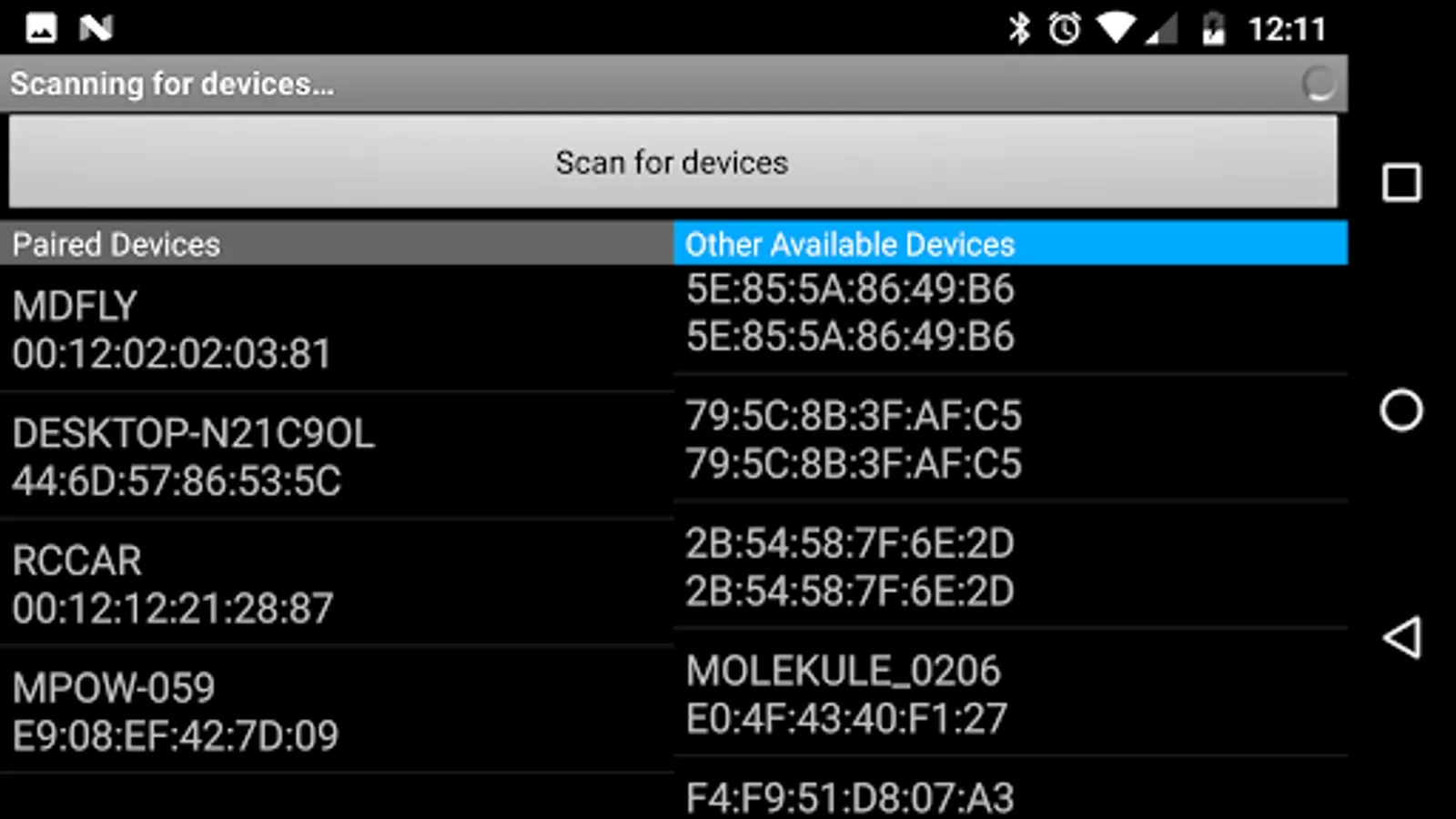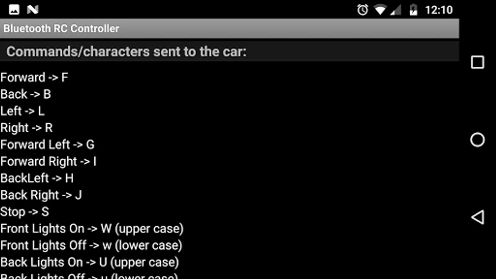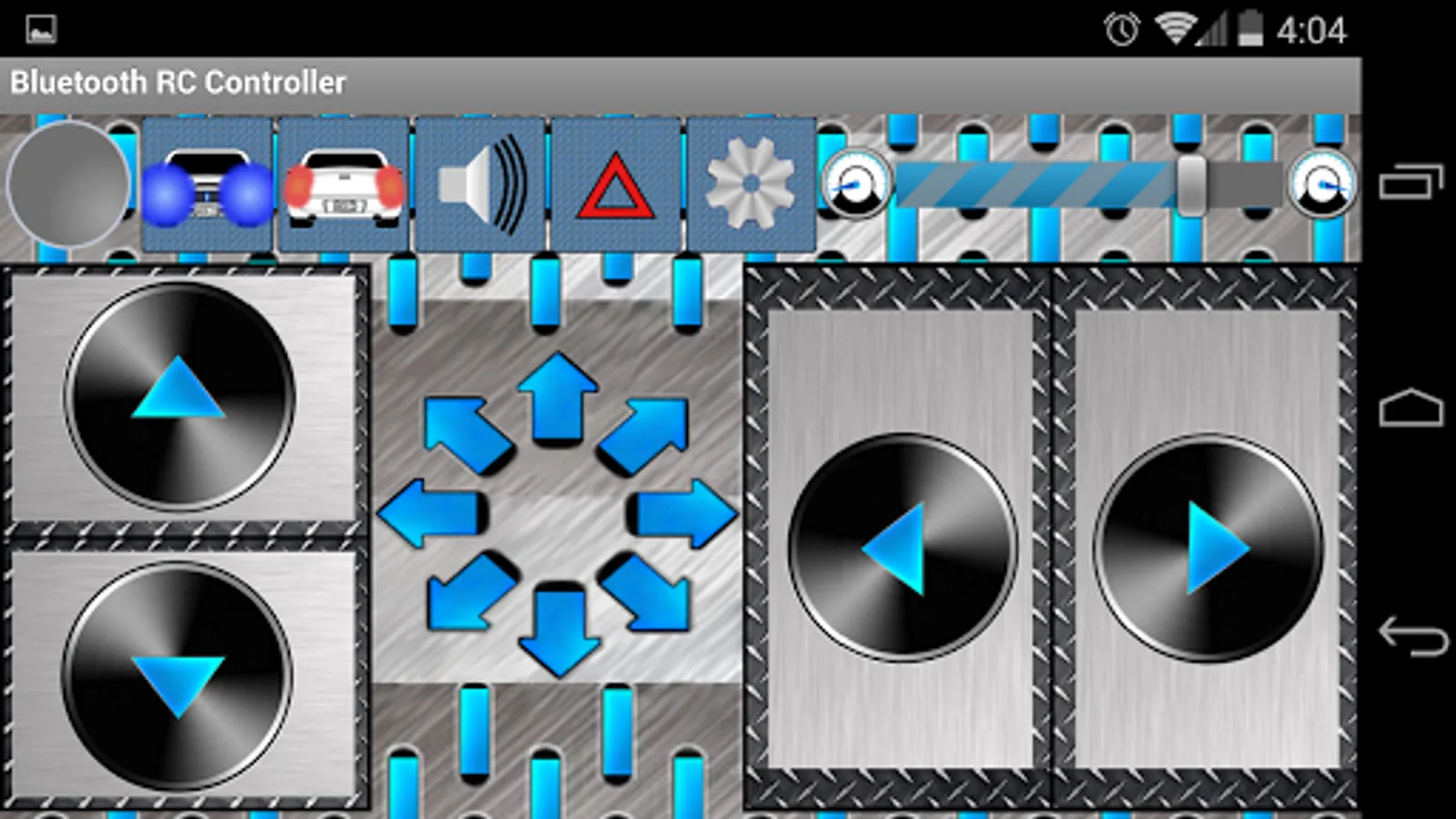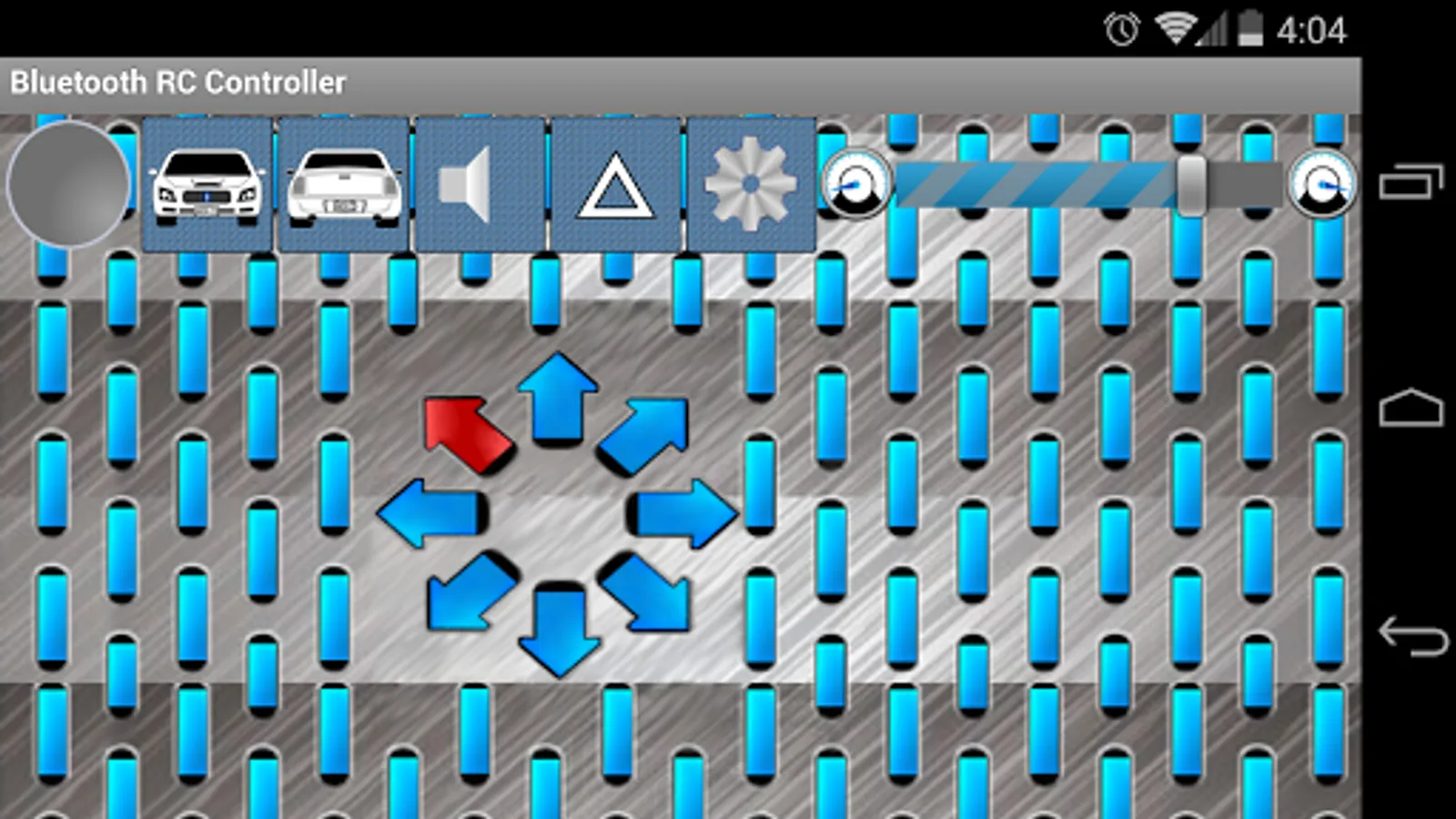 The application allows you to control a micro controller and Bluetooth fitted RC car with your smart phone. Visit this site https://sites.google.com/site/bluetoothrccar/ for the code and control circuit. The app lets you control the car with either virtual buttons or the phone's accelerometer. A slider bar allows you to control your car's velocity if the car's control circuit has this feature. There are also two buttons for front and back lights. A flashing light lets you know when the phone is connected to the car, and arrows light up letting you know the car's driving direction.