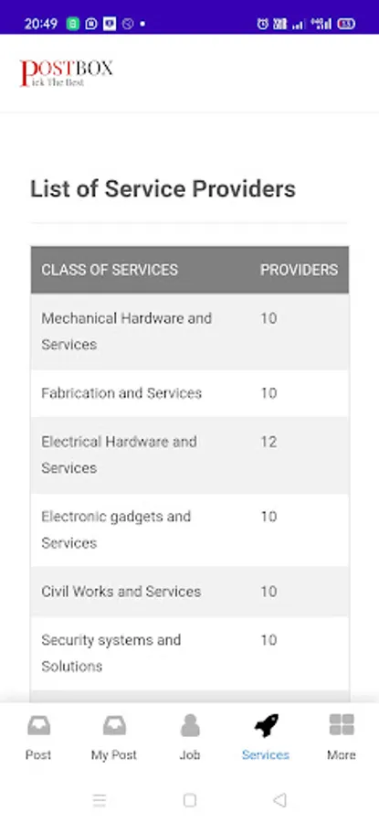 Civil works, Mechanical hardware and services, Security systems and services, plumbing and services, Fabrications and services, Tools and travels, Catering and services.