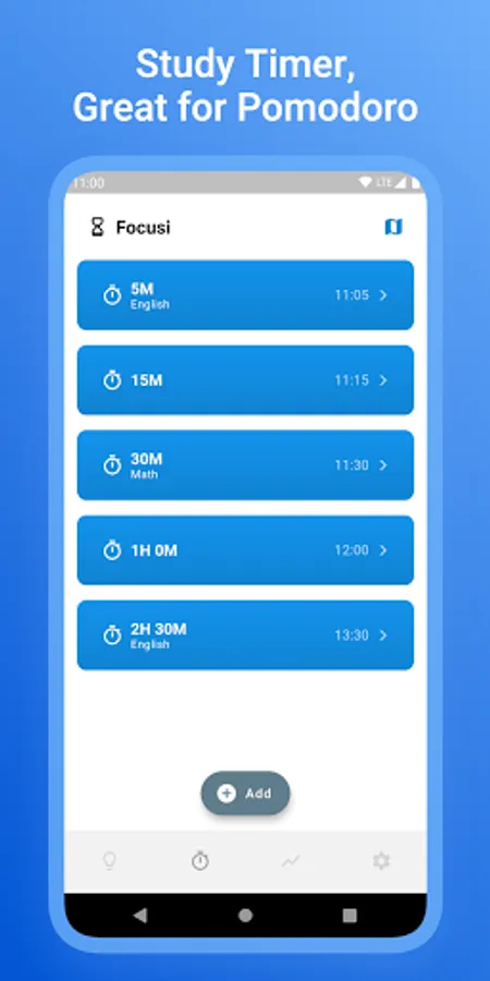 - Multiple time frames(15, 30, 60 minutes etc.) that can be added or removed freely. You can use these as pomodoro sessions or for breaks.