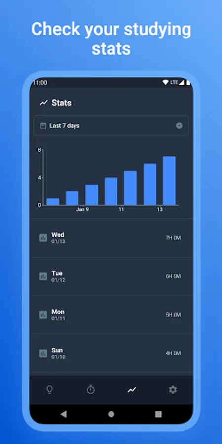 - Bar graphs that show the time you have spent studying with the app for the last 7 days/14 days(can be extended further with premium).