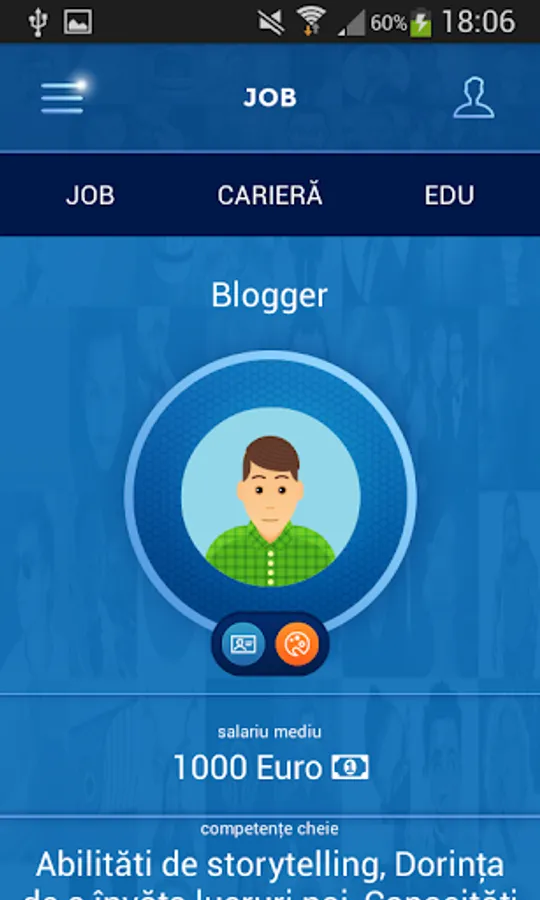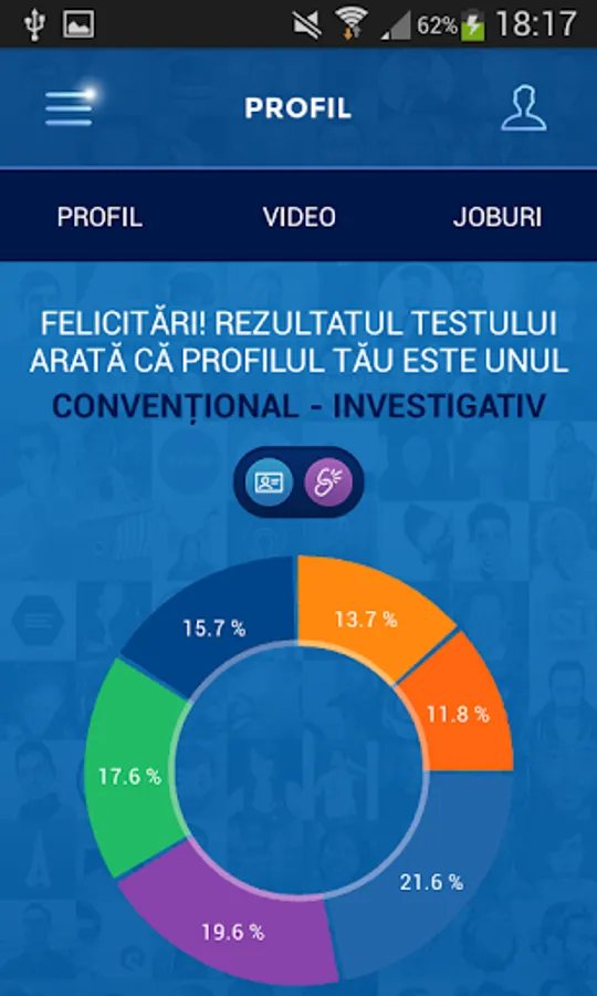 În funcție de răspunsurile tale, rezultatul iti determina un anumit profil iar aplicatia iti recomanda cariere potrivite. Vei primi informații cheie din piața job-urilor din România , sugestii detraseul educațional precum si de parcurs in carieră pe care trebuie să le iei in calcul pentru a ajunge unde iti dorești. La final vei putea lua o decizie de carieră având informațiile importante în față.