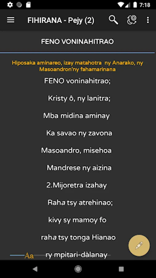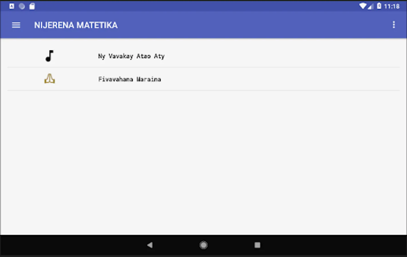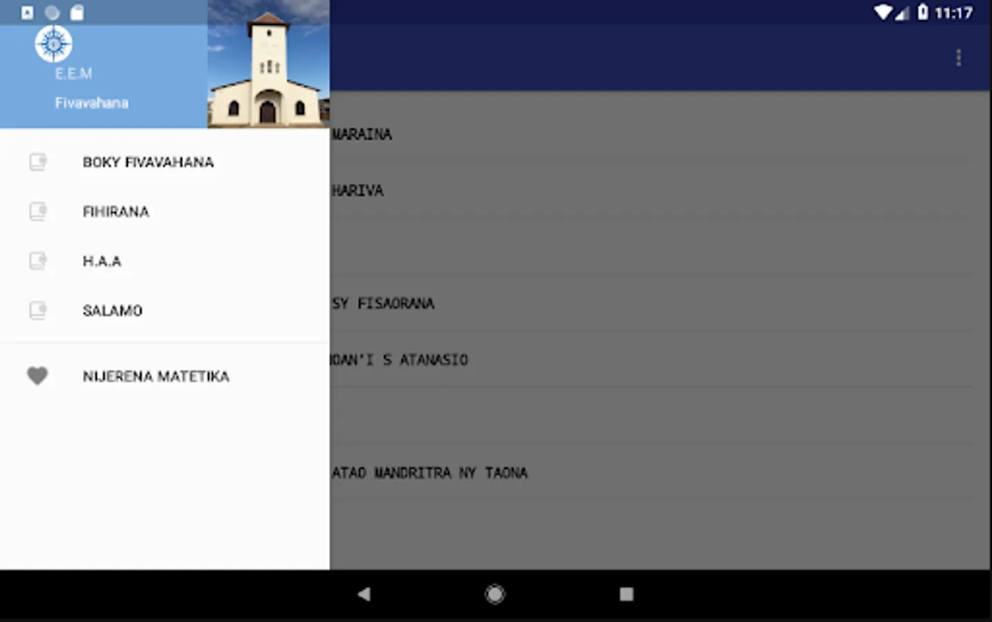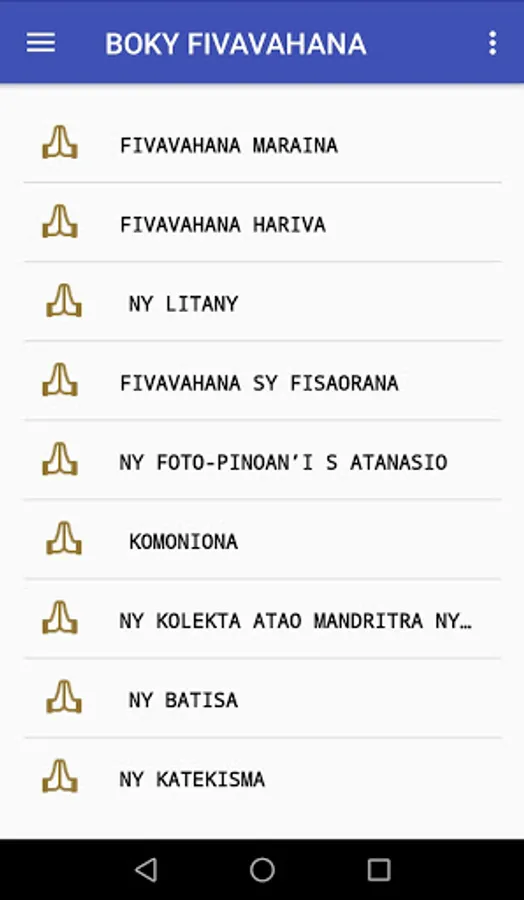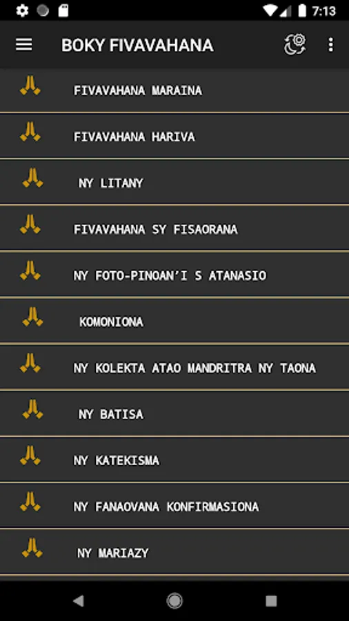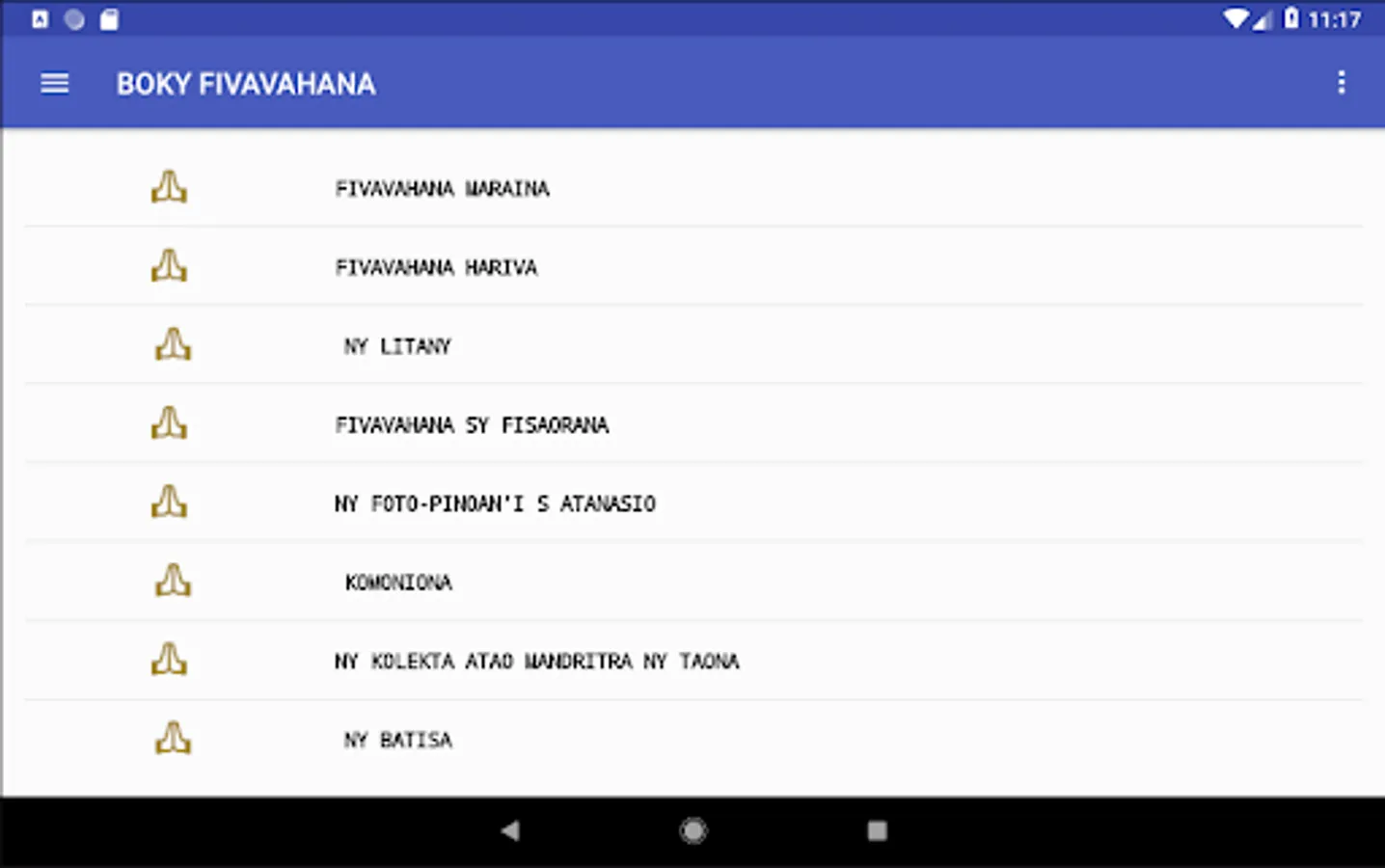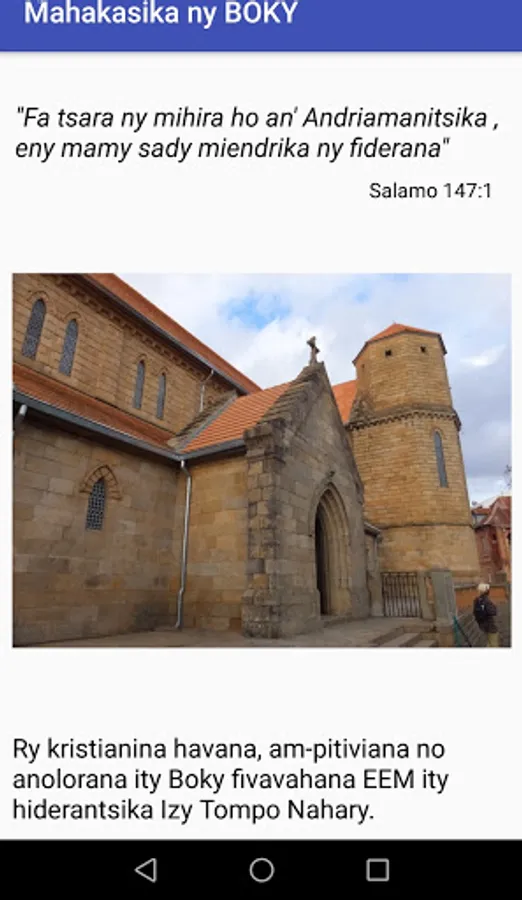 This application contains the Christian hymns of the Anglican Church in Malagasy version. It brings together psalms, the various hymns of Christian events as well as the usual prayers included in the Anglican Malagasy liturgy.