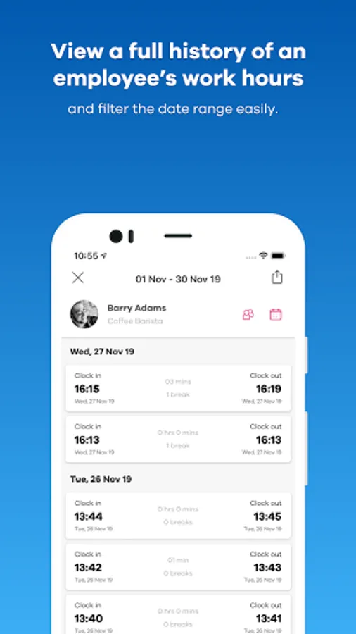 Your staff use Blip to scan a QR code—a type of barcode—when they arrive and leave work. Then, each time they scan the code, Blip will register them as clocked in or out. It’s that simple.
