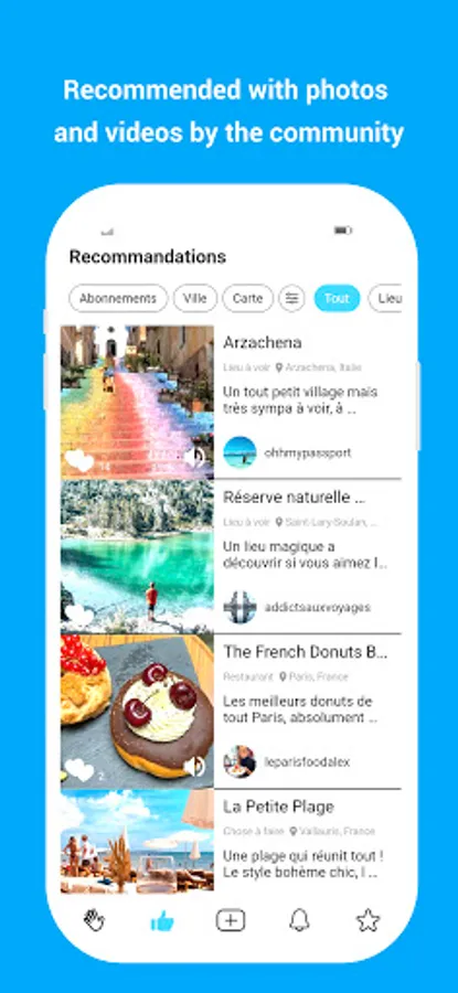 Browse the news feed to discover new tips and find new inspirations, or search directly for the best addresses for your next trip by entering your destination and using the different categories.