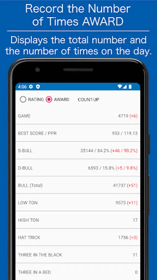 ・Display of average rating of any combination of count-up, cricket count-up, 01, and cricket of your choice