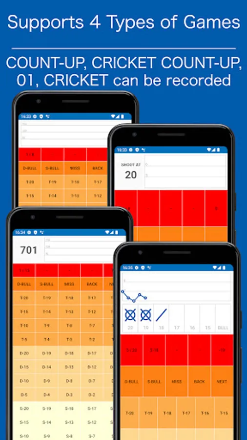 Recodarts records count-up, cricket count-up, 01, and cricket scores with a simple tap of a button corresponding to the darts score, and automatically calculates and displays PPR, MPR, pseudo-rating, flight, class, bull rate, triple rate, etc.