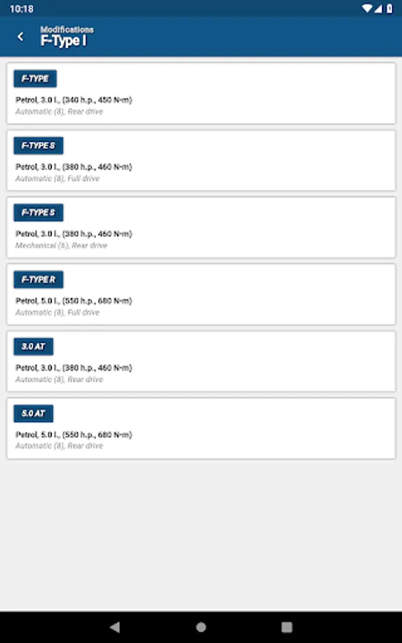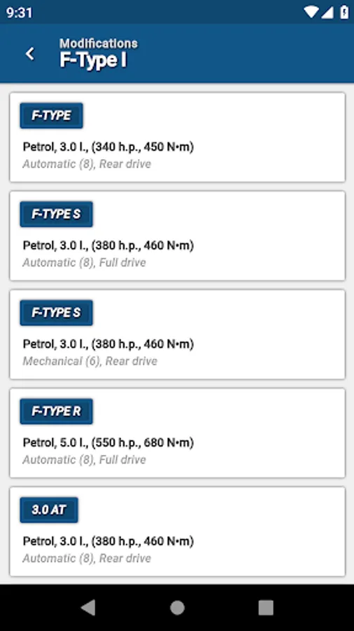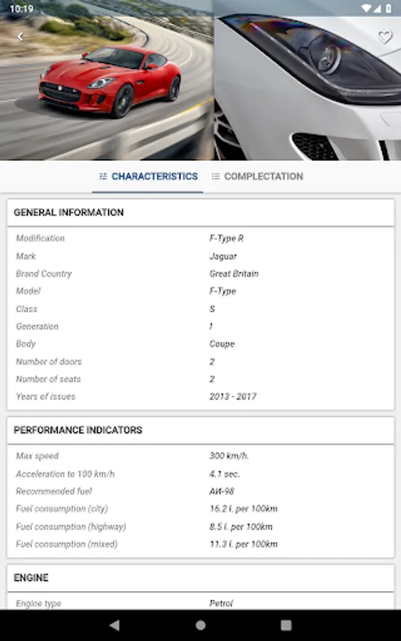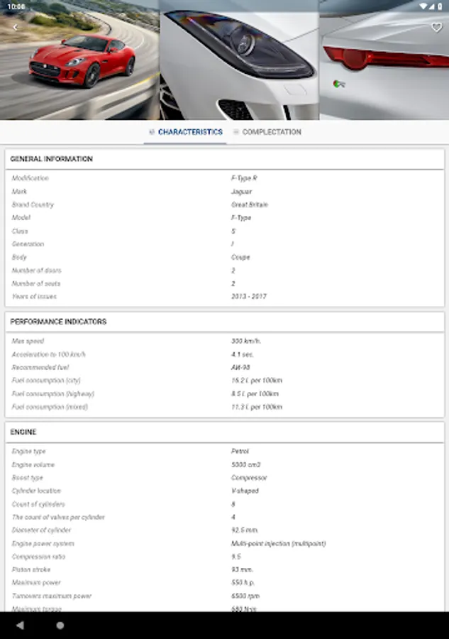 Modification, Completion, Brand, Model, Brand native land, Generation, Count of doors, Count of seats, Years, Maximum speed, Acceleration time to 100 km/h, Recommended fuel, Fuel consumption, Environmental standard, CO2 emissions, Engine type, Engine location , Engine volume, Boost type, Engine power, Max torque, Engine power system, Compression ratio, Cylinders arrangement, Number of Cylinders, Number of Cylinders, Number of Valves, Cylinder, Piston, Gear, Number of Gear, Drive, Length, Width, Height, Wheelbase, Front Wheel Drive, Rear Wheel Drive, Ground Clearance, Wheel Size, Curb Weight, Acceptable Full Mass, Fuel tank capacity, Luggage capacity, Front suspension, Rear suspension, Front brakes, Rear brakes.