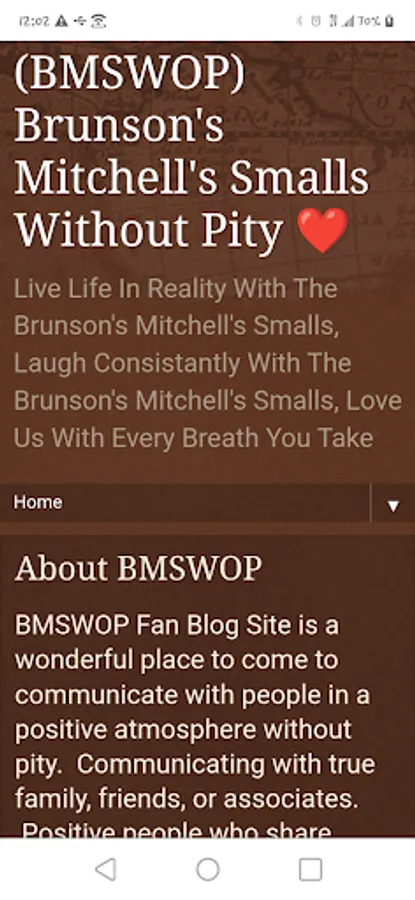 BMSWOP Fan Blog Application Is A Wonderful Place To Come And Communicate Amongst Our Family Members And Others Alike. People With A Positive Atmosphere Without Pity. It's All About Sharing Special Moments With Our Families, And Communicating With True Family Members And Others Alike. Live Laugh Love While Sharing Events, Pictures, And Awesome Communication With True Family Members And Others Alike. For Family Members That Are Far Off To Reach With Hugs And Kisses, You Can Email, Call, Or Text On This App With The Greatest Exposure.