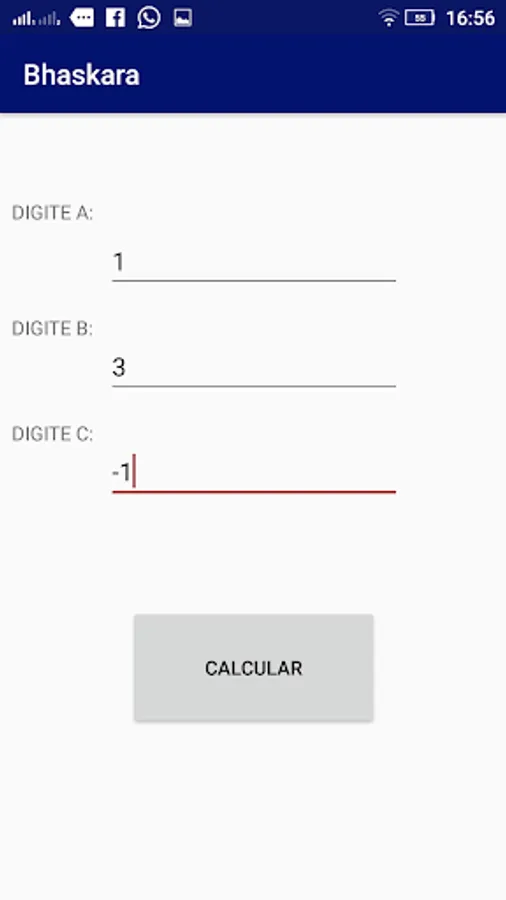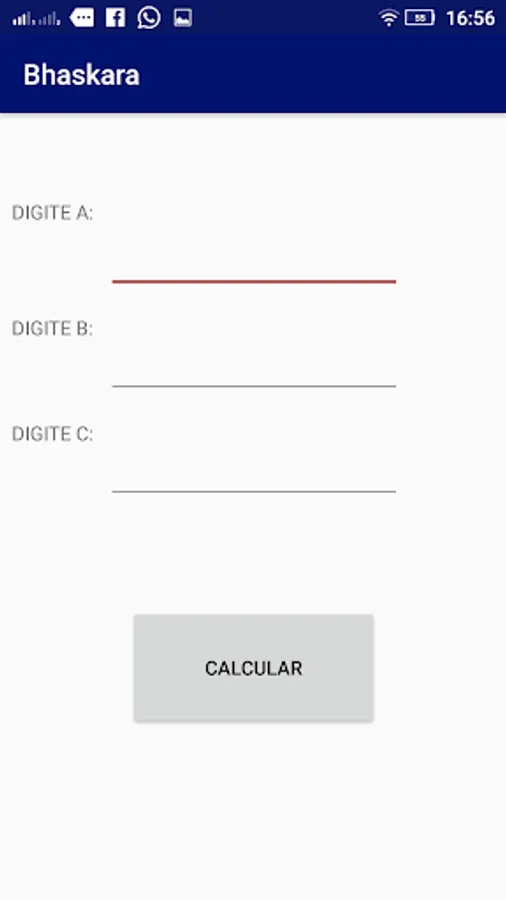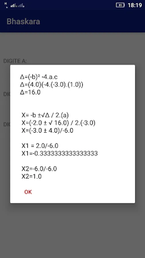 Bhaskara Calculator, shows Delta , x1 and x2 .