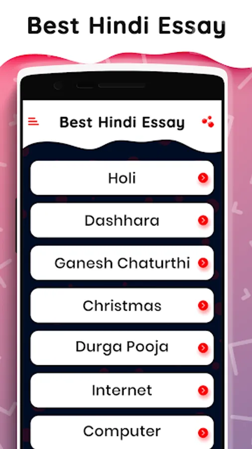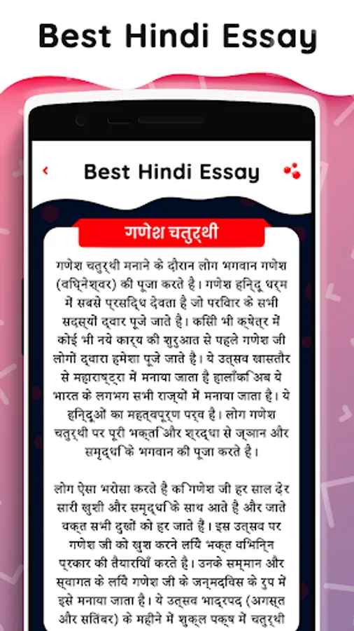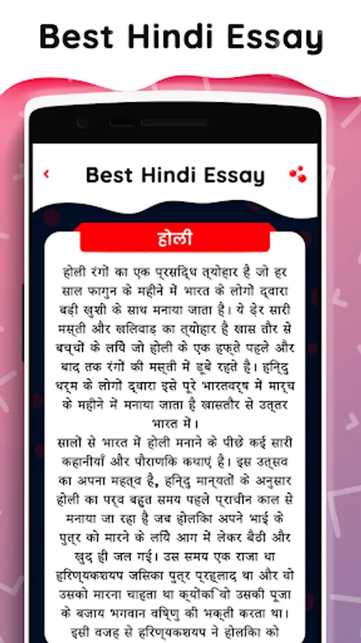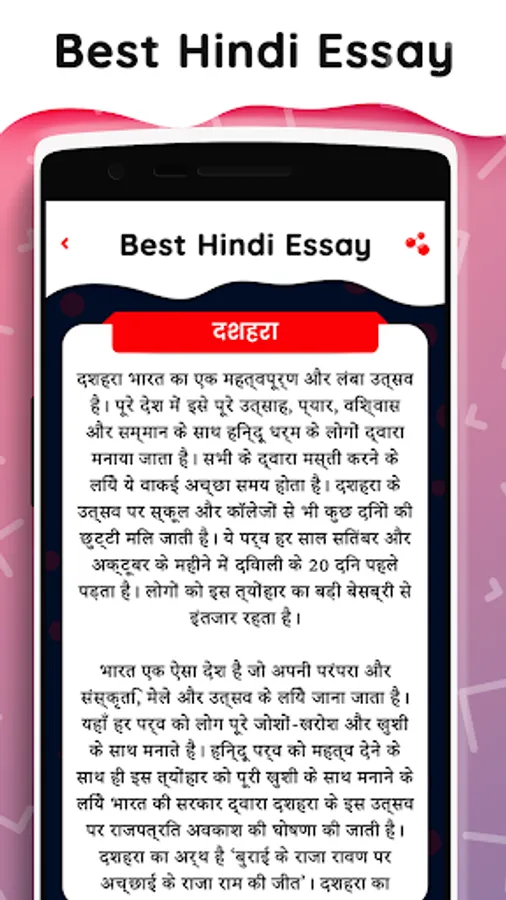 Welcome to “Hindi Essay” App, in this app Hindi Essays on various categories. Hindi Essay app is very simple and user friendly. User can read more than 500 Hindi Essays. All Essays in this app mainly divided in many categories:-