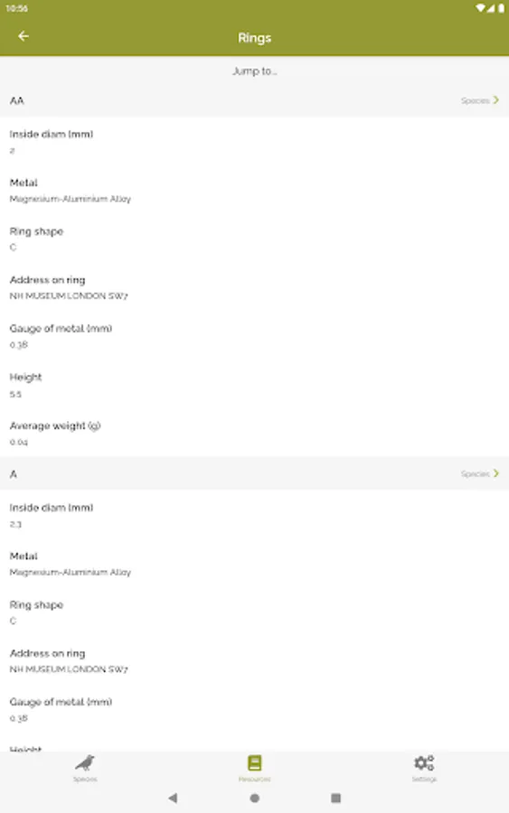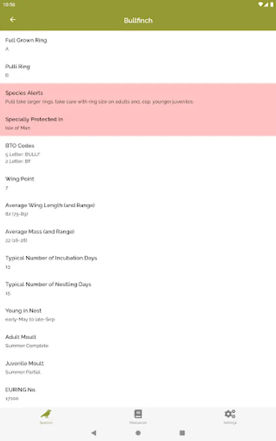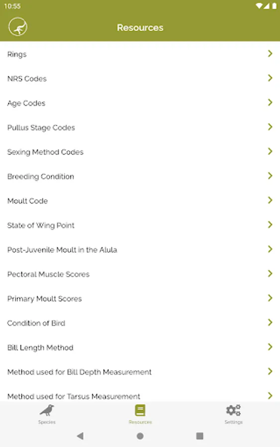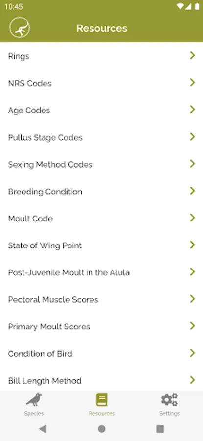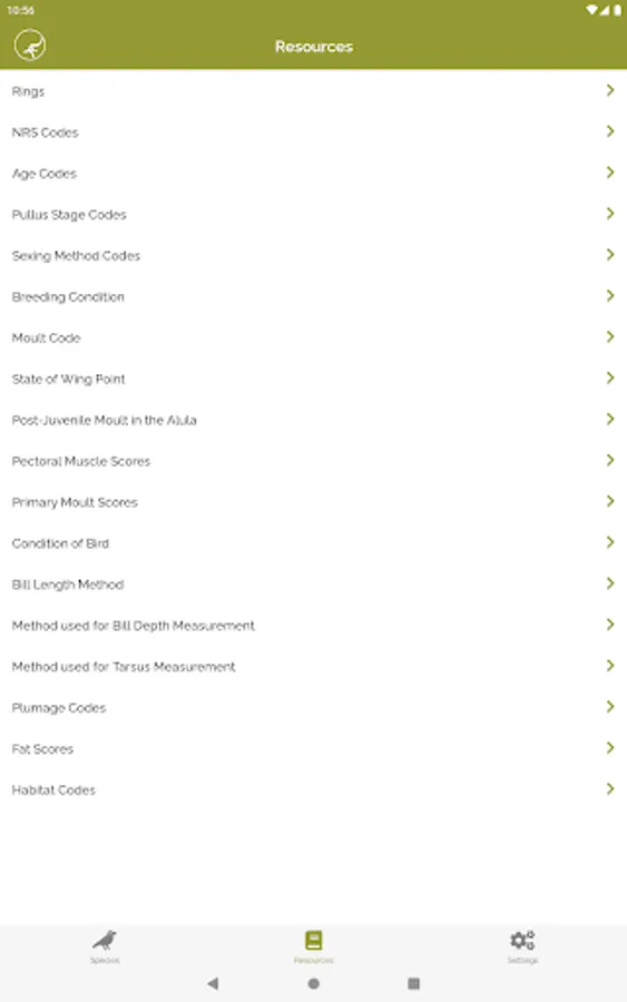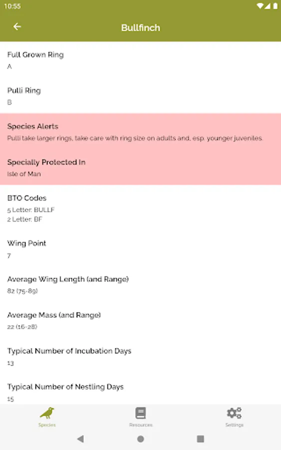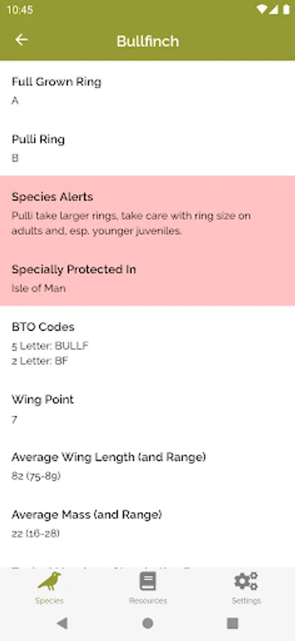 An app to help bird ringers, nest recorders and scientists check the correct ring sizes/codes to use for each bird species ringed in the UK (for both full-grown birds and pulli) and the codes needed to record nests and their contents. The app also includes the codes needed to record biometrics, condition and status information for each bird as well as the standard habitat codes.