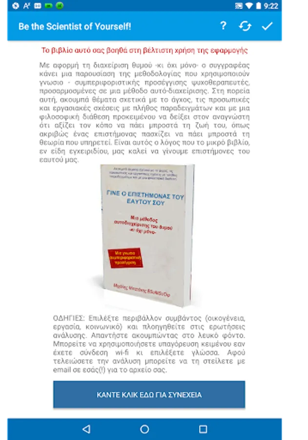 It helps in self-analysis of self-management in order to manage anger, anxiety, depression. Accompanying application for Android phones and tablets of the book series 'Be The Scientist of Yourself' for those who are hesitant to enter a process of self-knowledge and invaluable help for those who intend to start Cognitive-Behavioral sessions. Easy to read, understandable and "to the point".