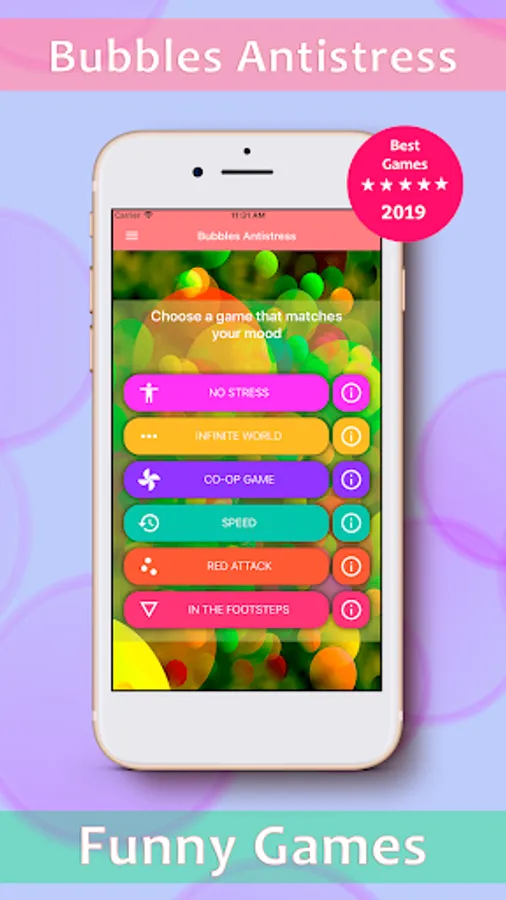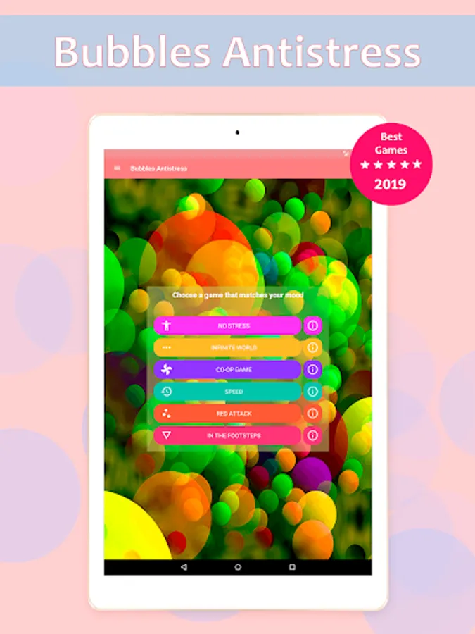 1. NO STRESS is a relaxing game without seven very long levels. You just burst the bubbles and go to the next level. Each level has its color shade.
