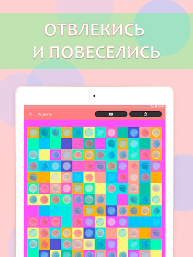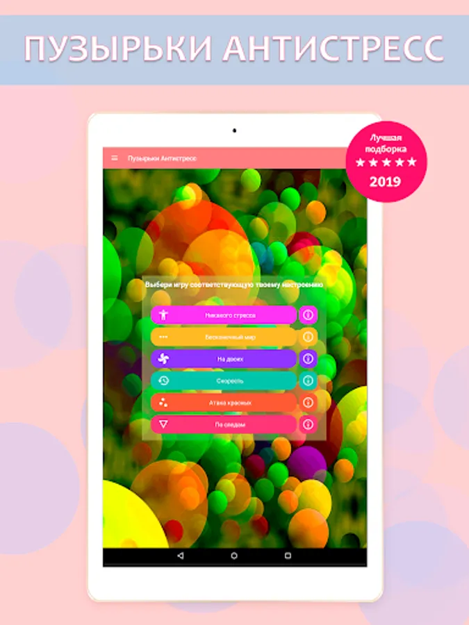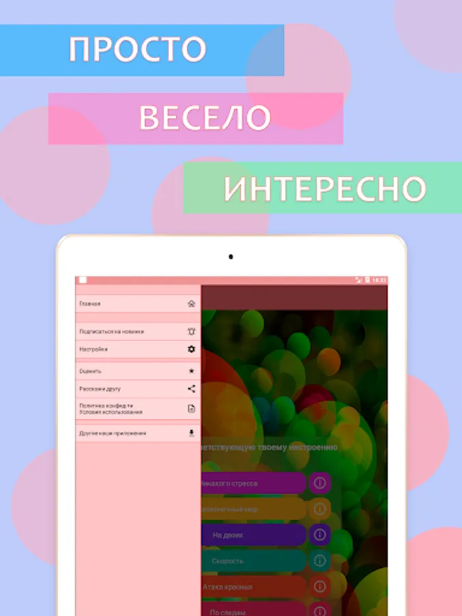 1) "No stress" is a relaxing game with different levels. Each level has its own color shade.
