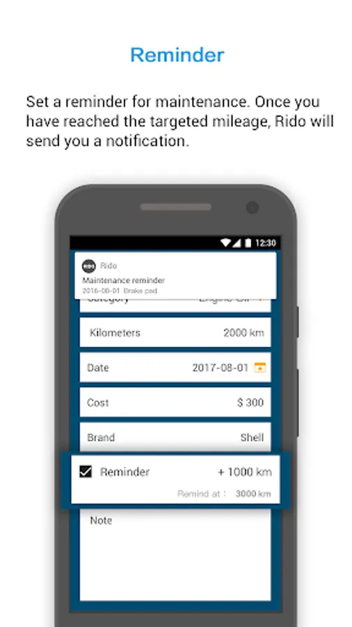 You can set a reminder for maintenance. Once you have reached the targeted mileage, Rido will send you a notification.