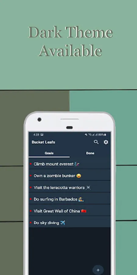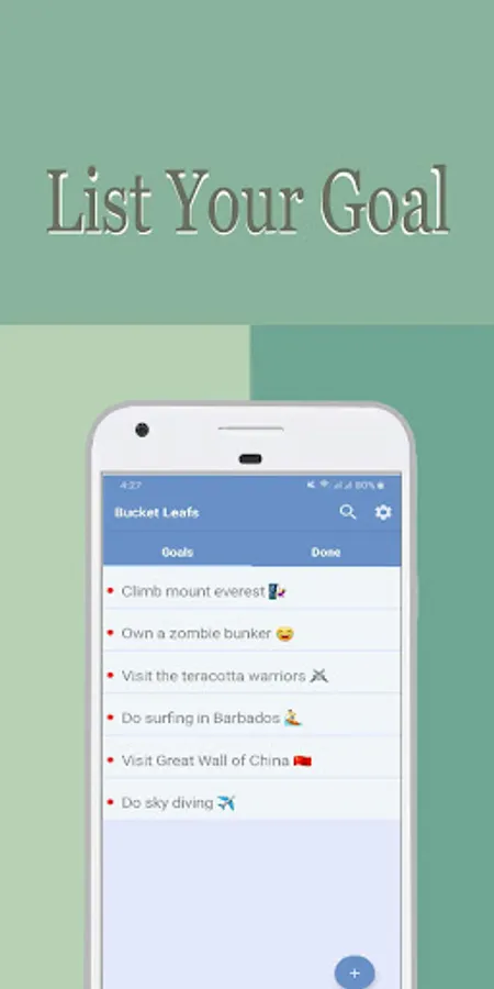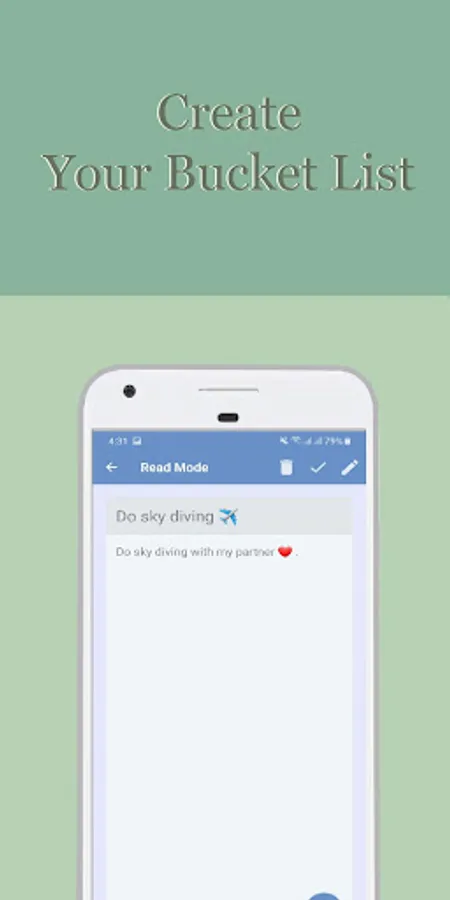 In this goal / bucket list application , you can keep all goals and things in your bucket list . The app don't use date or reminding system in order to keep your from rushing them .