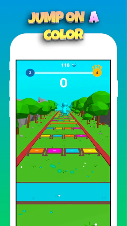 Every time you jump on a color, the character gets the color he touched. Complete the level and collect as many diamonds as you can.