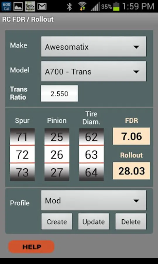 Use onscreen wheels to adjust spur and pinion gear sizes to view final drive ratio. Use the onscreen wheel to adjust tire diameter to view rollout.