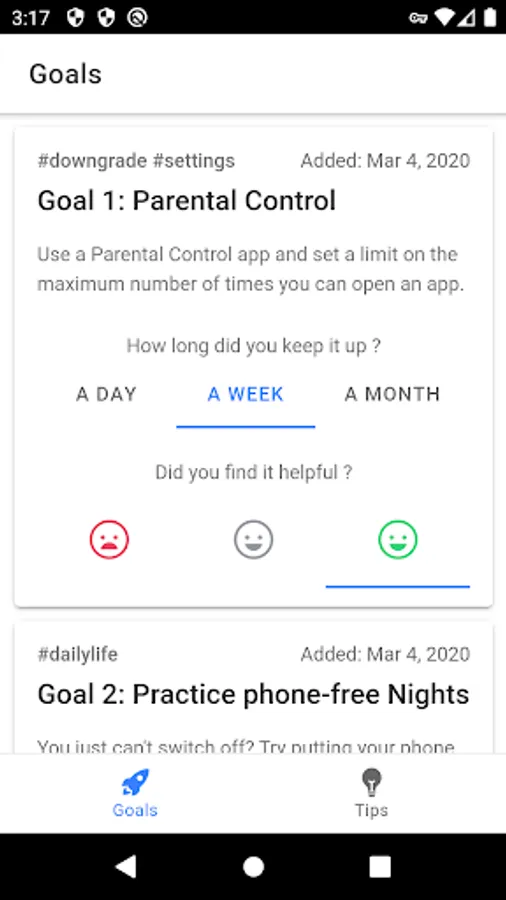 Digital Habits aims to help you develop healthy digital habits. It comes with tips to reduce digital distraction, and a feature to keep track of your habit goals.