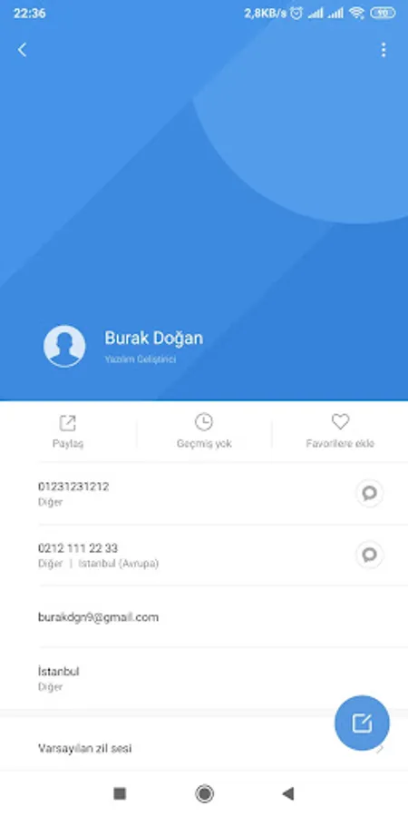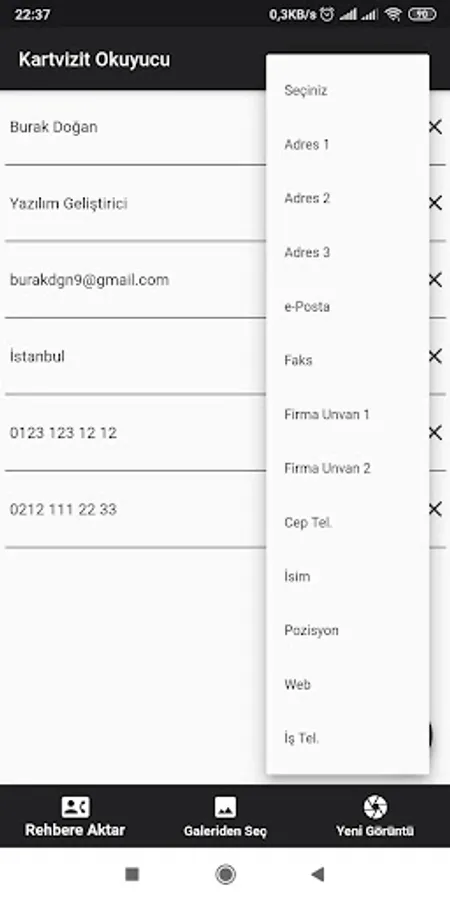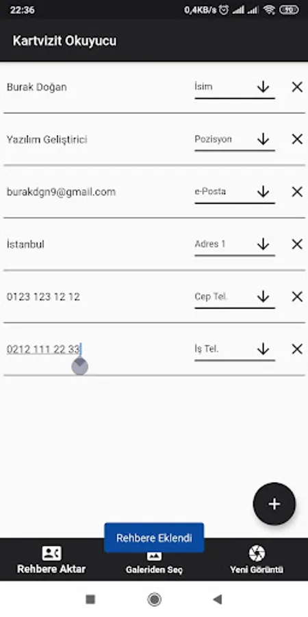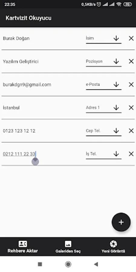 You can scan the text on the business card and create a contact card in your directory, either by taking a new image from your camera or by choosing an image from your gallery. You can store information up to name, company, phone, address, website and e-mail details.