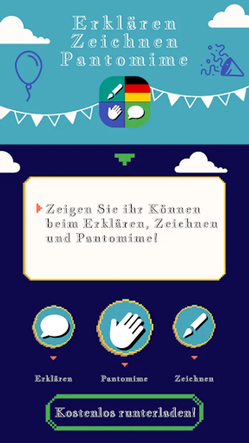 You and your friends will try to explain terms, draw or pantomime them. Your team needs to guess as many of these terms as possible. A certain amount of time is available for this. Then it is the turn of the next team. The better you explain, draw or pantomime the term, the easier it will be to guess. There is then one point for each guessed term. Play as many rounds as you want and in the end the team with the most words guessed correctly wins.