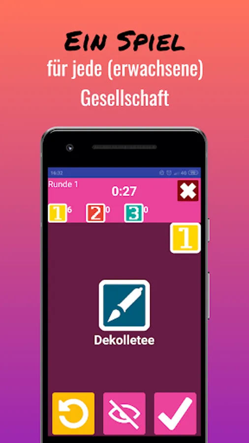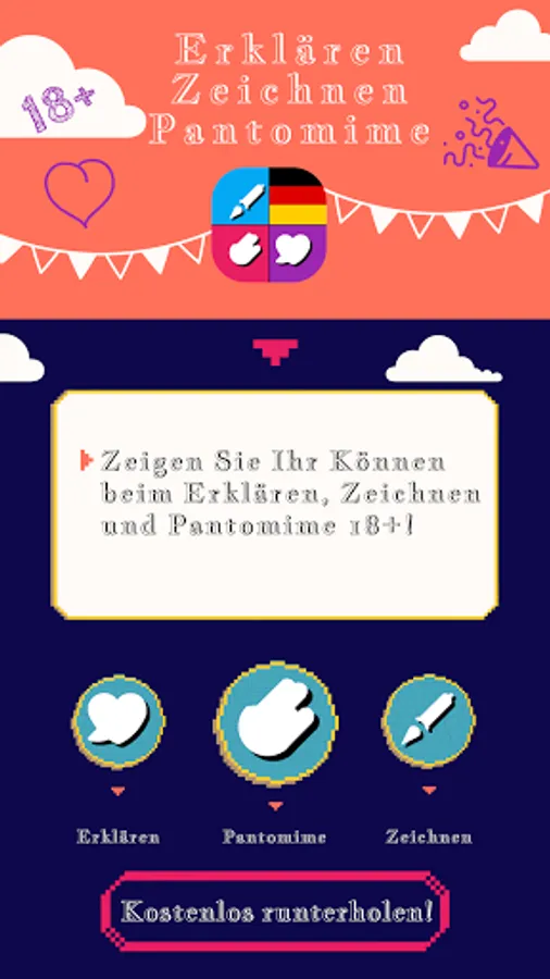 The terms are chosen randomly, as well as whether they should be explained, drawn, or shown by pantomime. This leads to an entertaining parlor game, which will give you a lot of funny and above all embarrassing moments.
