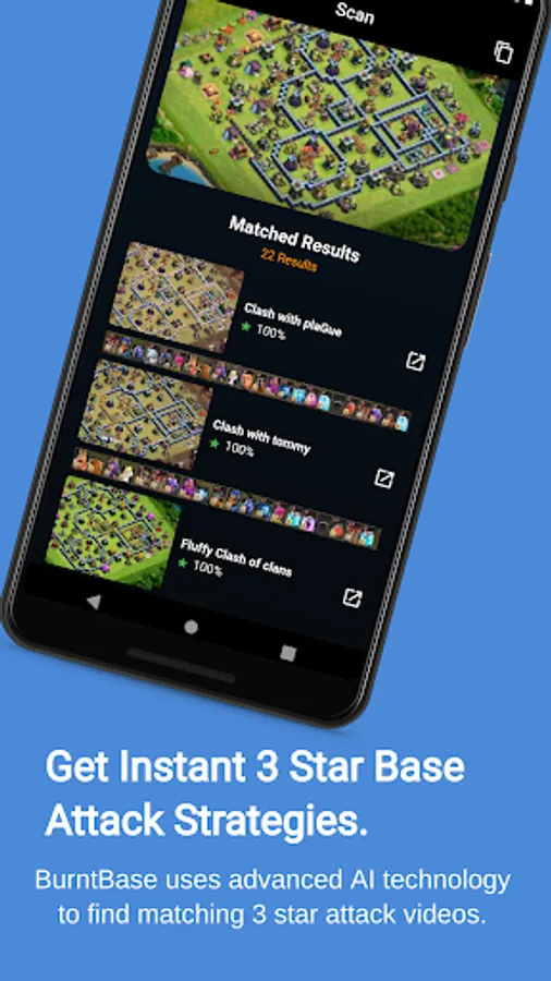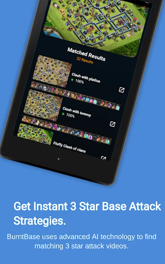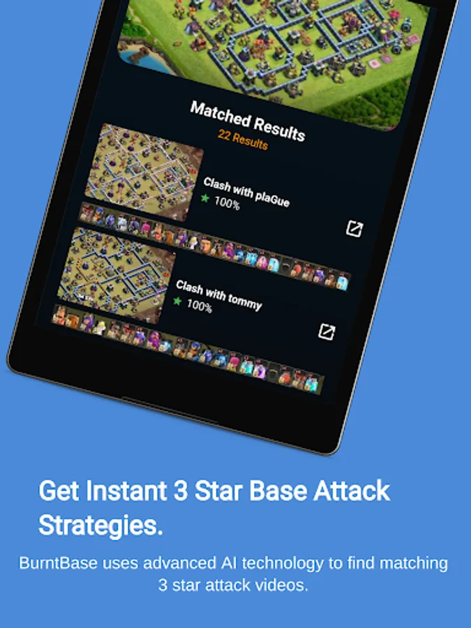 BurntBase is a Clash tool used to identify bases that have been 3 starred, protect against using weak bases, and help with troop selection and attack planning. Don’t spend hours searching YouTube. Search bases with BurntBase and within seconds you will know if that base has been 3 starred and get links to 3 star attacks.