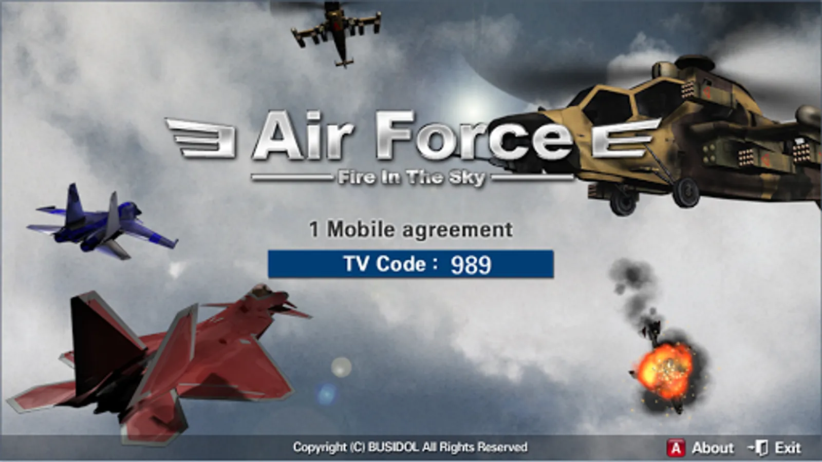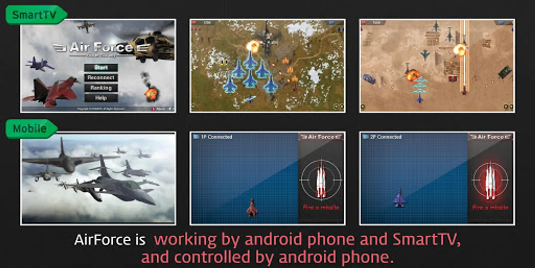 Airforce is flying shooting game, and this game is working by android phone and smartTV, and controlled by android phone. and this game is used touch sensor of android phone, can be controlled move technique side to side, vertical