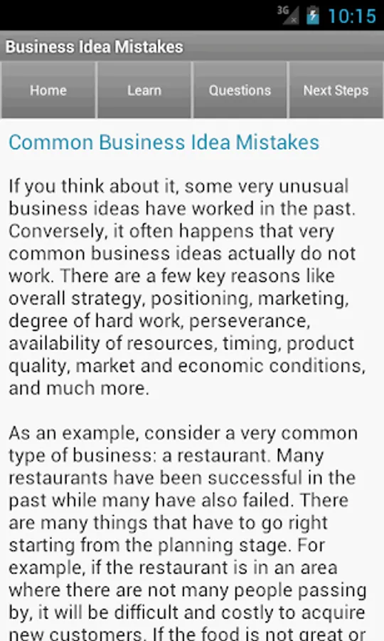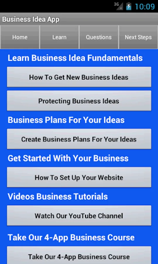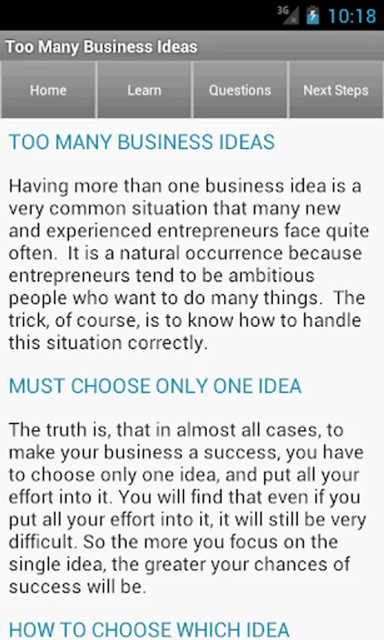 This app focuses on business ideas. It contains articles on these business entrepreneur topics: