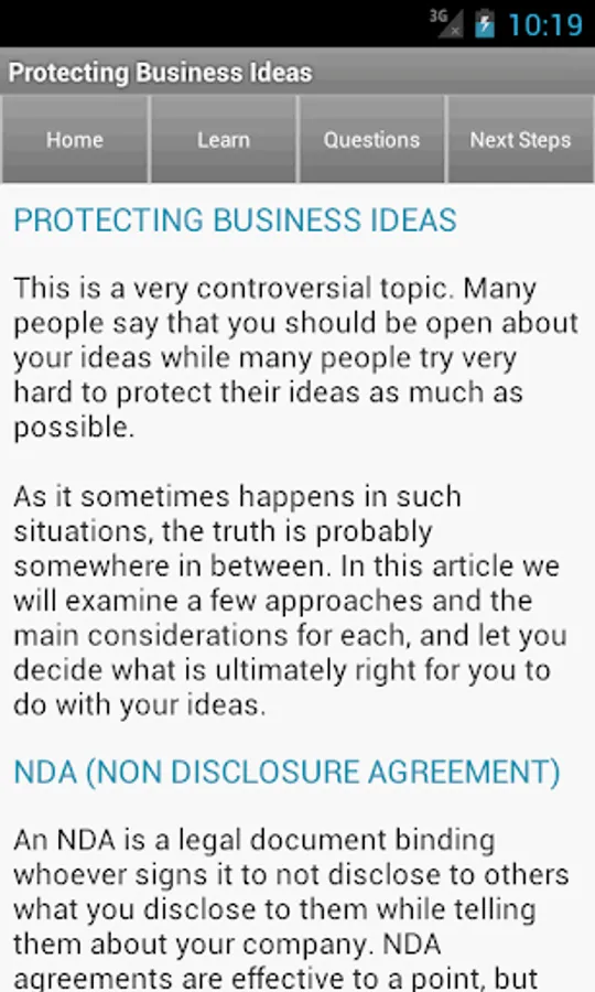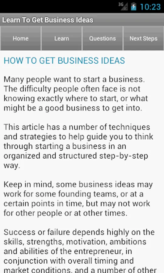 This app contains articles on getting business ideas, protecting business ideas, and how to generally think about business ideas. In addition to the articles, there is a list of 100 business ideas. In addition to that, there is a tool to help you begin planning your own business - all on this one app!!