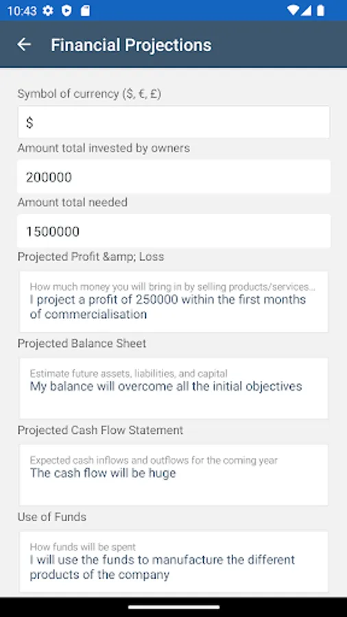 - Financial projections: Important part on the different projections, money needed to start the activity and use of the funds
