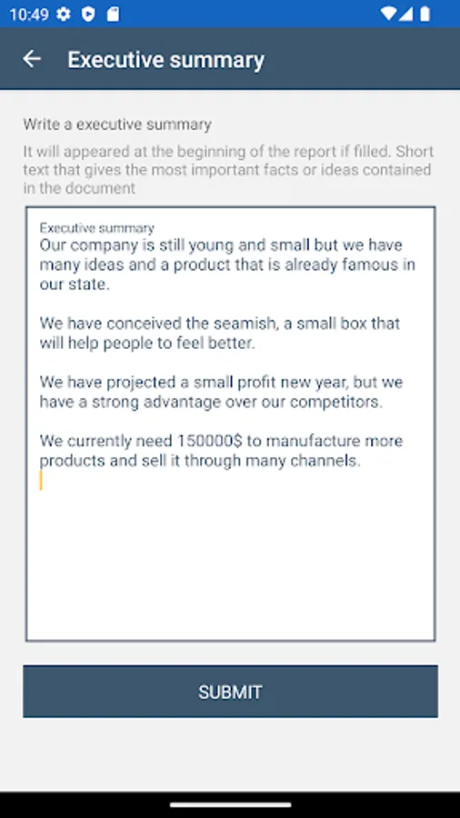 - Executive summary: explain the main information of the company and its main objectives