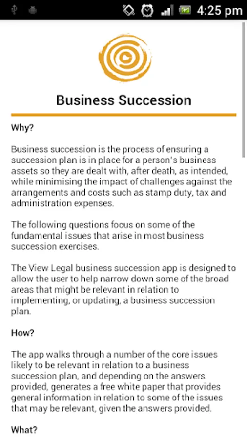 The View Legal business succession app is designed to allow the user to help narrow down some of the broad areas that might be relevant in relation to implementing, or updating, a business succession plan.