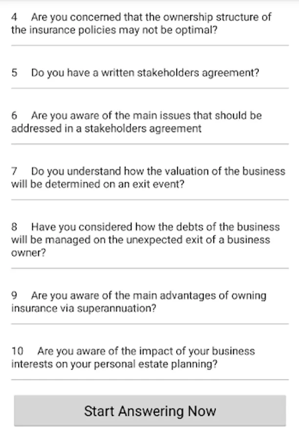The app walks through a number of the core issues likely to be relevant in relation to a business succession plan, and depending on the answers provided, generates a free white paper that provides general information in relation to some of the issues that may be relevant, given the answers provided.