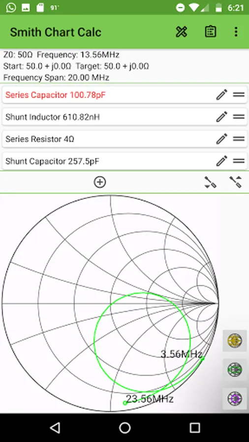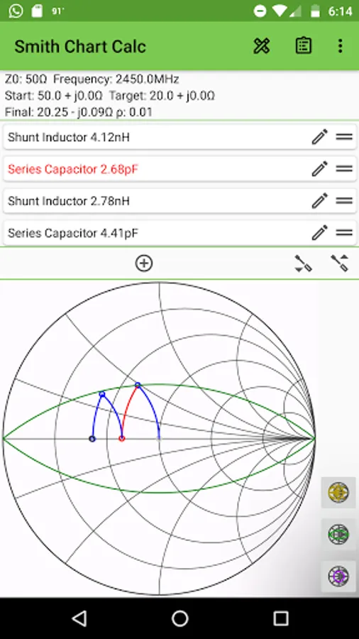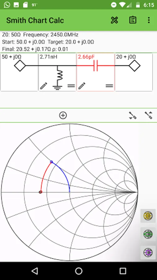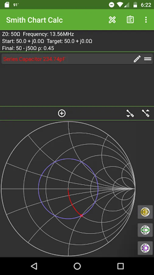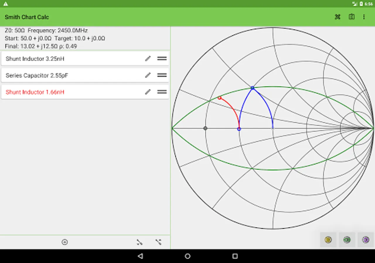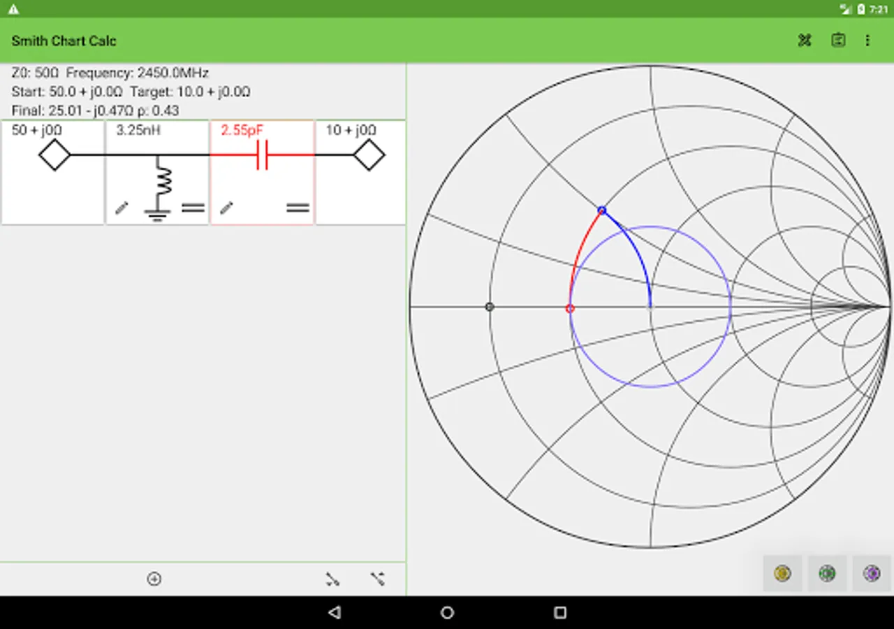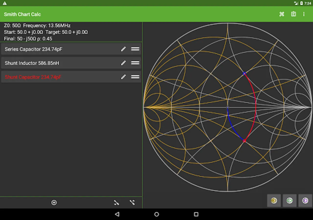 This app allows you to design RF impedance matching networks using the classic medium of the Smith Chart. You can set the properties for the chart, build your matching network from a range of components, then view results and see how the network behaves over a frequency range.
