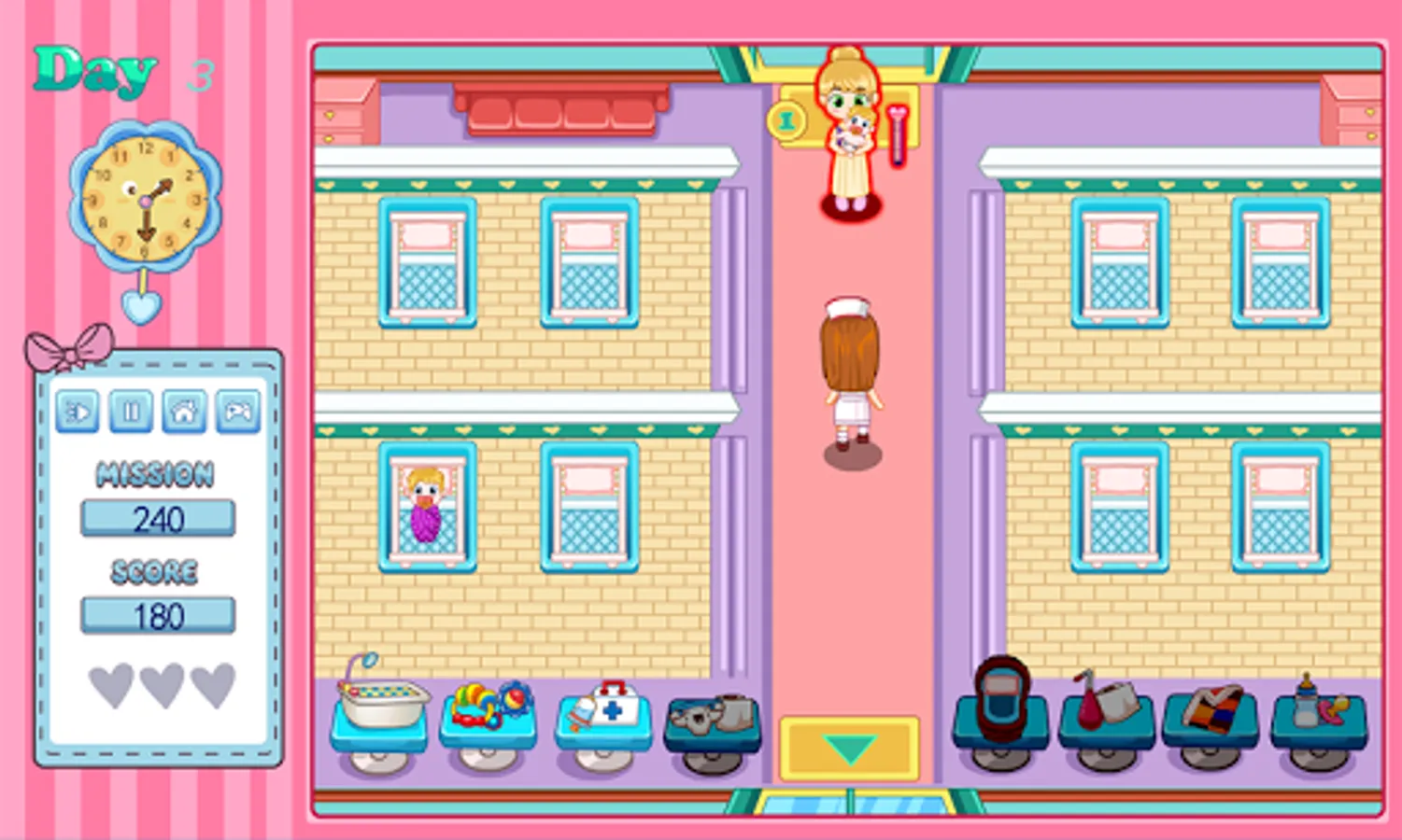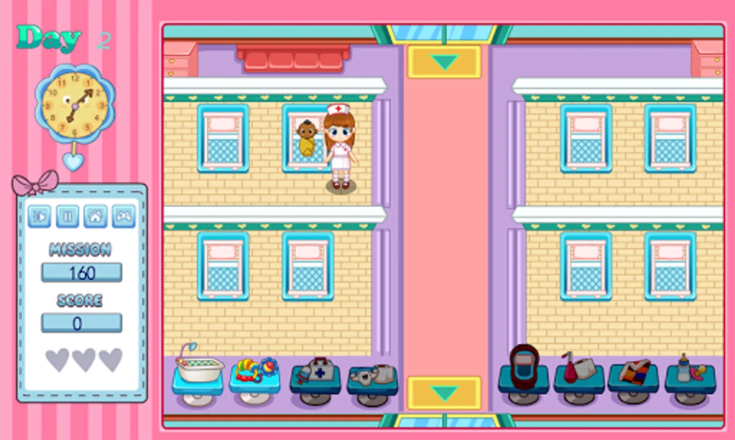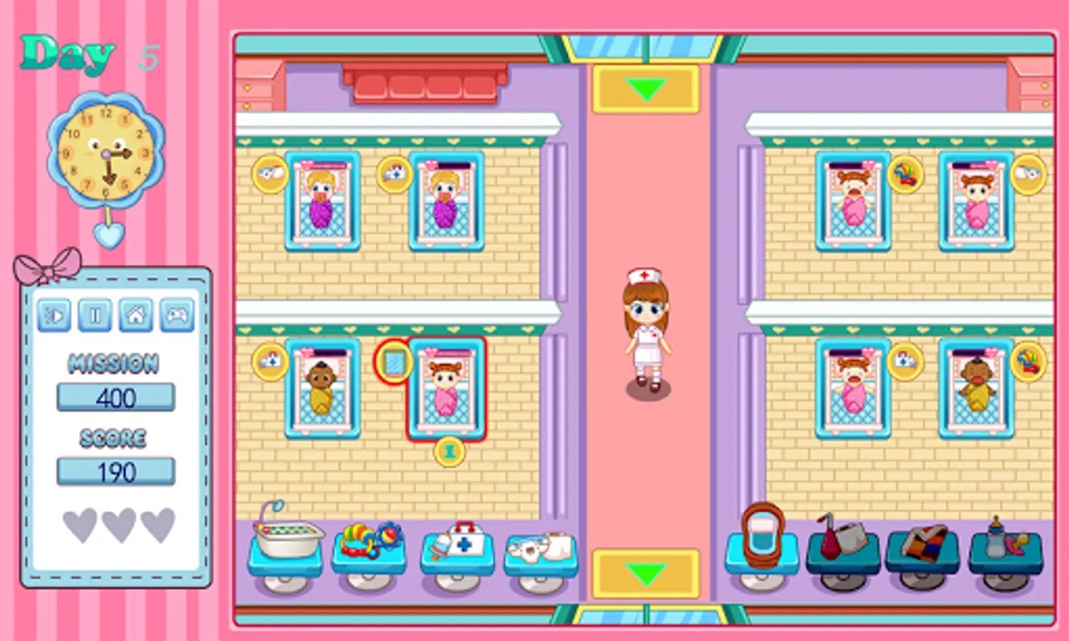 Start your job in the hospital by providing emergency care. In this fun nursery game, you'll be responsible for taking care of all of the newborns that come into the nursery. You'll feed, bathe, change, give them medicine and more. Hurry up and make sure that all of the newborn patients get what they need before the timer runs out. When your patients are all happy, you win!