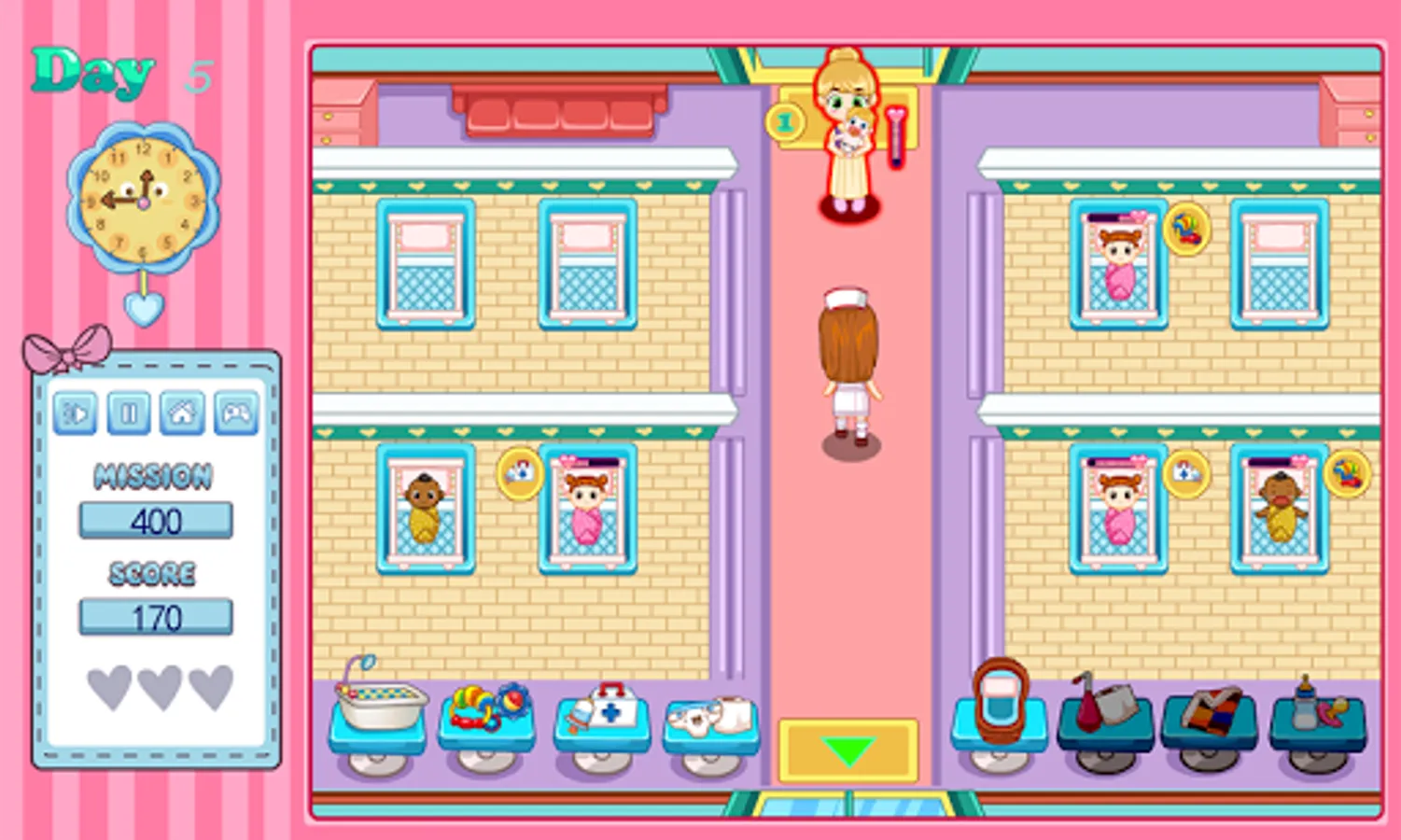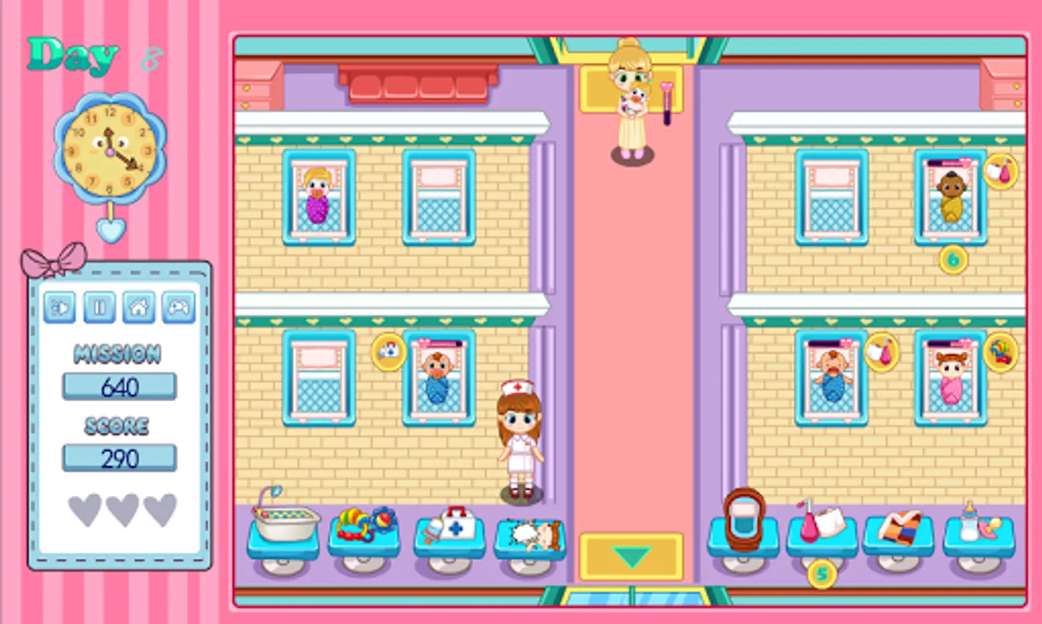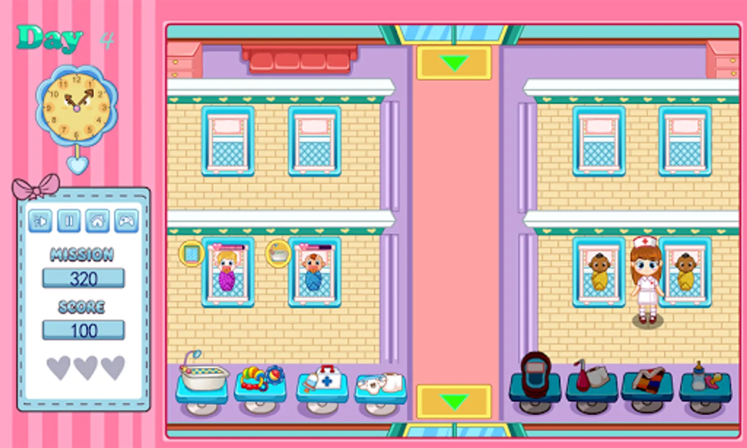 Start your job in the hospital by providing emergency care. In this fun nursery game, you'll be responsible for taking care of all of the newborns that come into the nursery. You'll feed, bathe, change, give them medicine and more. Hurry up and make sure that all of the newborn patients get what they need before the timer runs out. When your patients are all happy, you win!