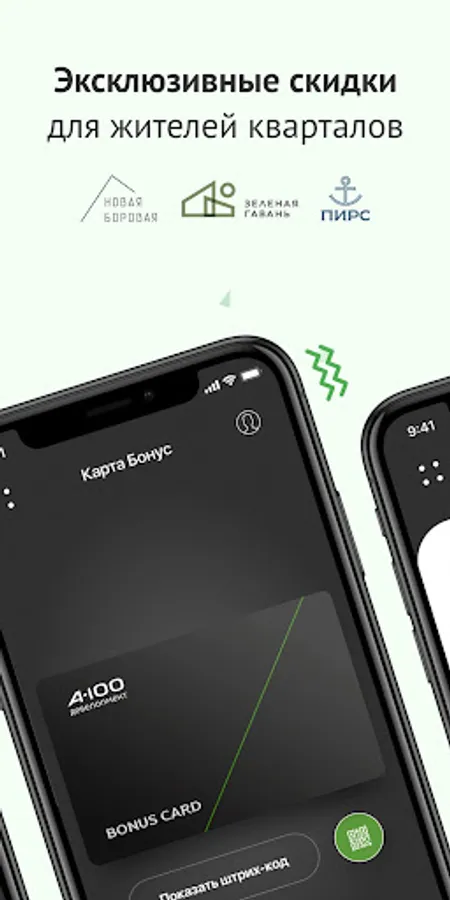 A-100 Development Bonus virtual loyalty card allows you to receive the best discounts in famous stores in Belarus. Partner companies prepared special conditions for residents of the Pirs, Zelenaya Gavan, and Novaya Borovaya quarters.