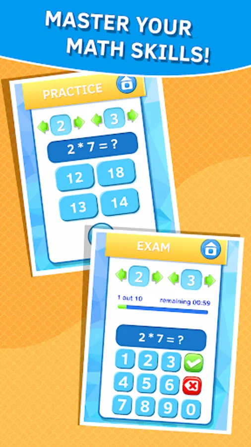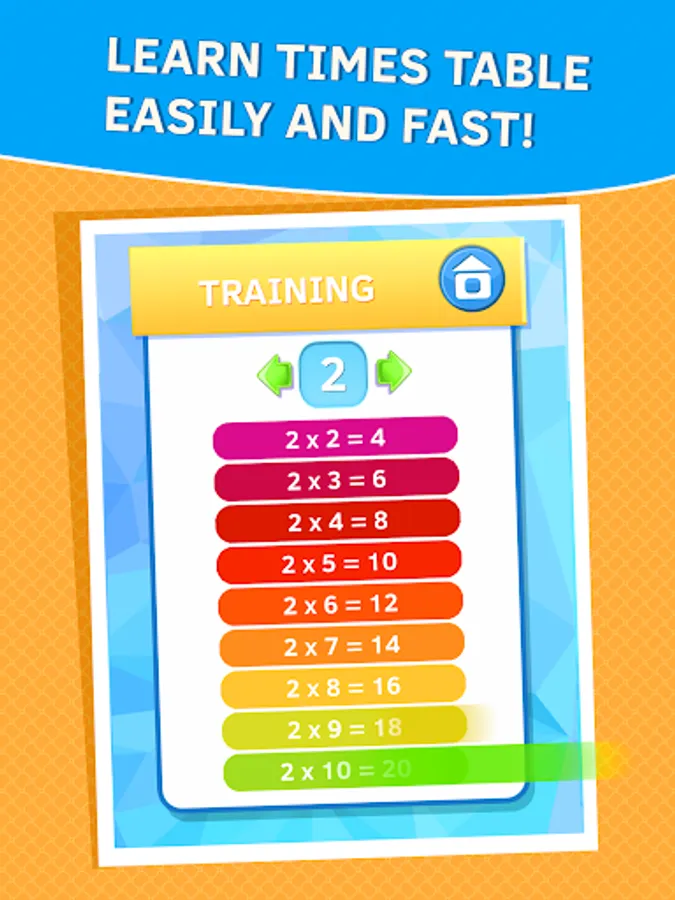 Our first lesson is multiplication tables. Learn how to multiply from 1 to 12 (now up to 20!). Just several minutes a day spent at this math academy will greatly enhance your knowledge of times table. Four game modes will help you to become a math master: