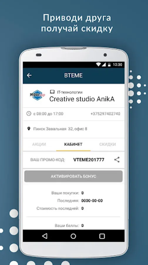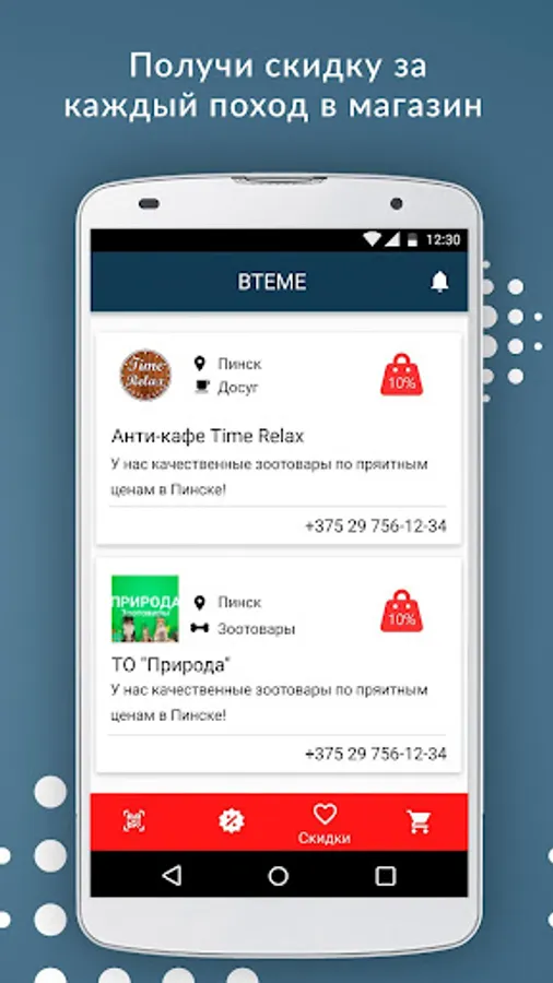 VTEME is an application designed to get bonuses and discounts in stores and shopping facilities, which you yourself add to the list of your favorite stores, which will be added as you join our discount service. Please be patient!