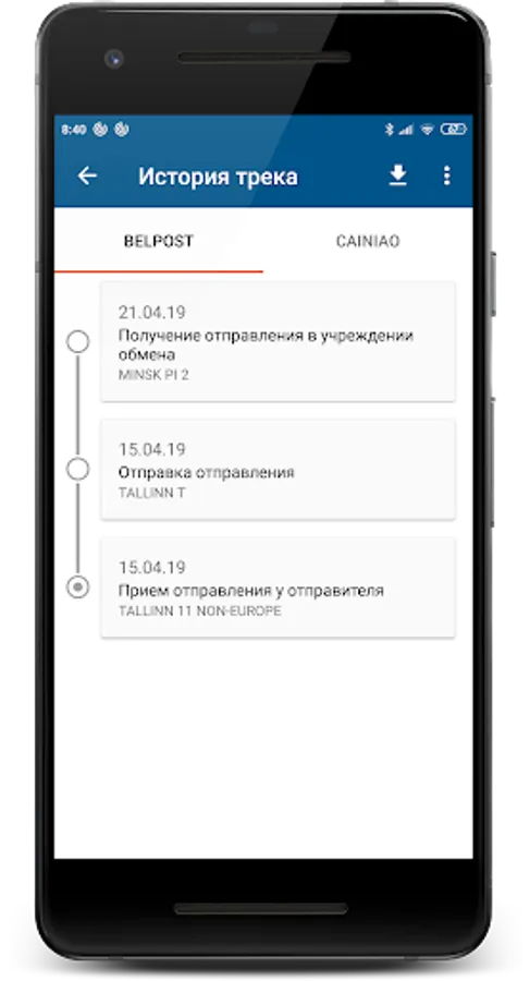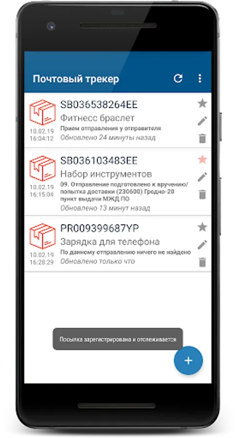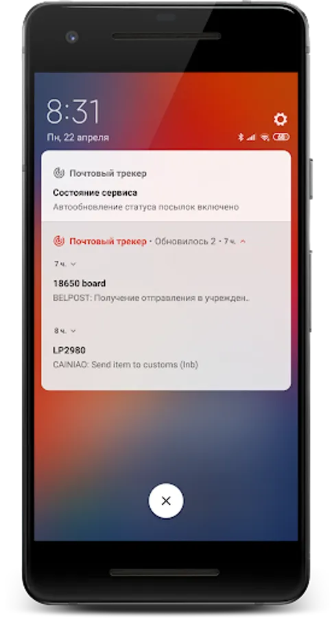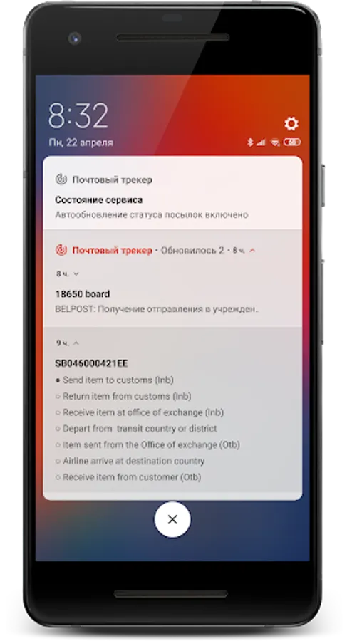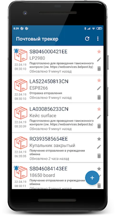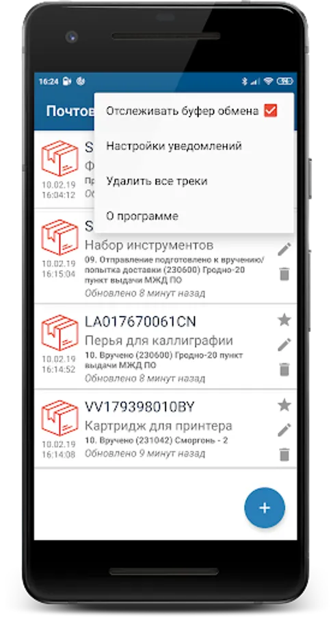 The application checks the status of your package on Belposhta and Cainiao sites (it uses aliexpress) at regular intervals, notifies when the package status changes, and also monitors the clipboard and, when copying track numbers in an application, creates a new task to track mailing.