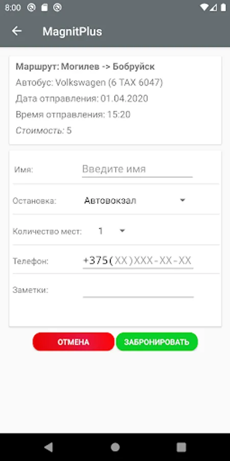 Our company provides custom transport services for intercity passenger transportation. Using the application, you can familiarize yourself with the schedule of minibuses following the route Bobruisk - Mogilev - Bobruisk and reserve a place in just a few seconds.