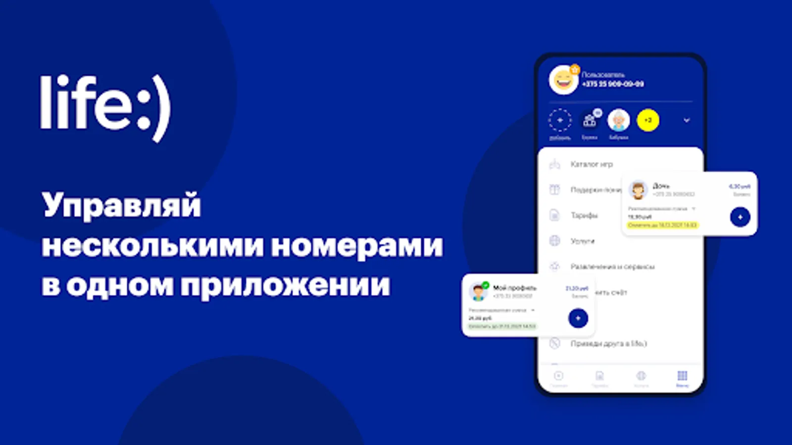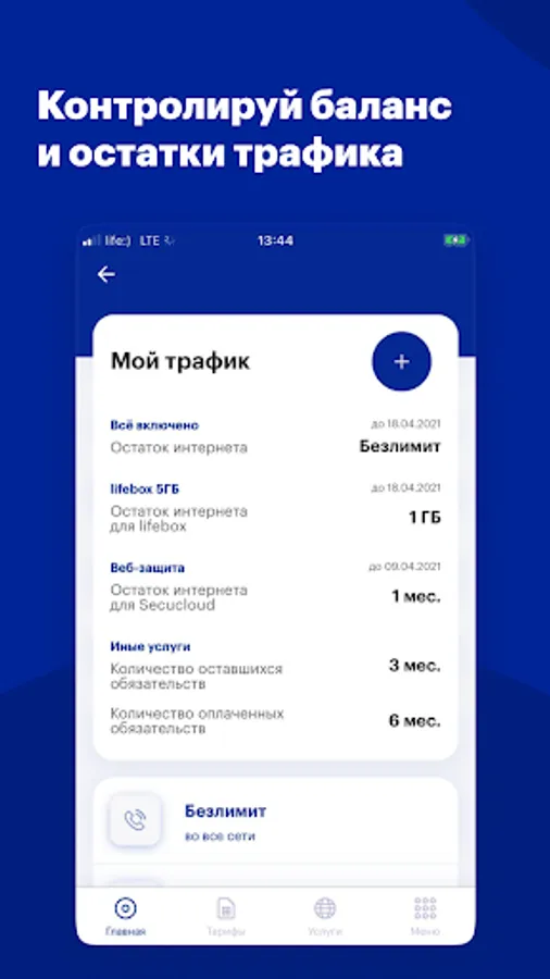 With My life :) it is easy to control the balance and the rest of the traffic, change the tariff, enable / disable services, find out about news and promotions of the operator. In one application, you can manage multiple numbers at once. Every week in My life :) you can receive free traffic and other gifts. The application works even when you have absolutely no traffic.