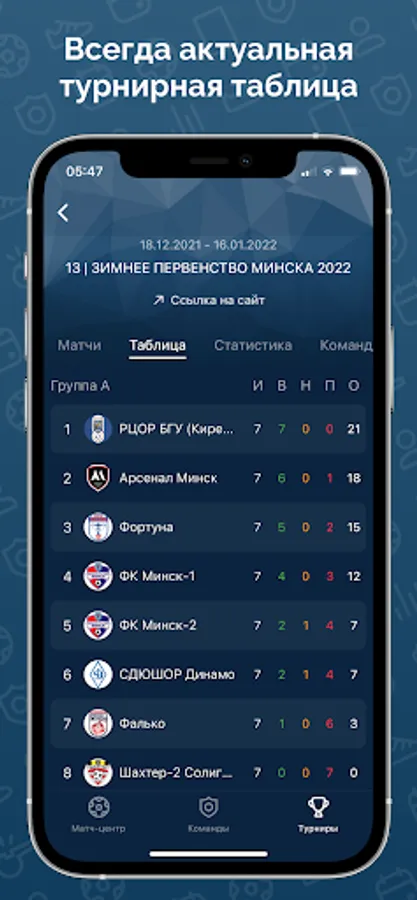 In the EKSA mobile application you will find up-to-date online tables and statistics of the main children's football tournaments held in the Republic of Belarus.