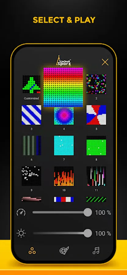 Use the App to directly connect to lights’ internal WIFI or bring the connection to your home WIFI, then you are able to select and play from the abundant effect gallery, switch between color palettes for certain effects, adjust brightness and speed, and remotely turn ON/OFF.