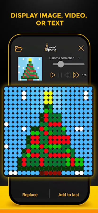Choose from 16 million RGB colors to draw your ideas to display on lights, or input image from your library with gamma correction. To create animated effects, you could add frames to draw, input GIFs, videos, or text ,then save your creations.