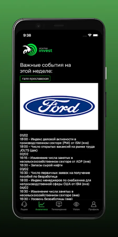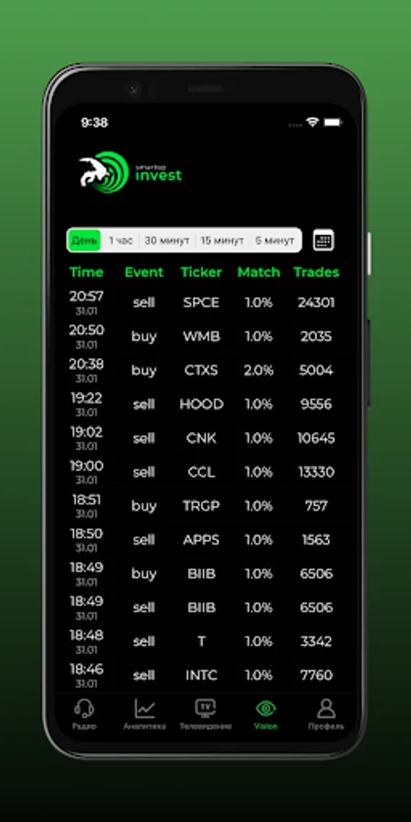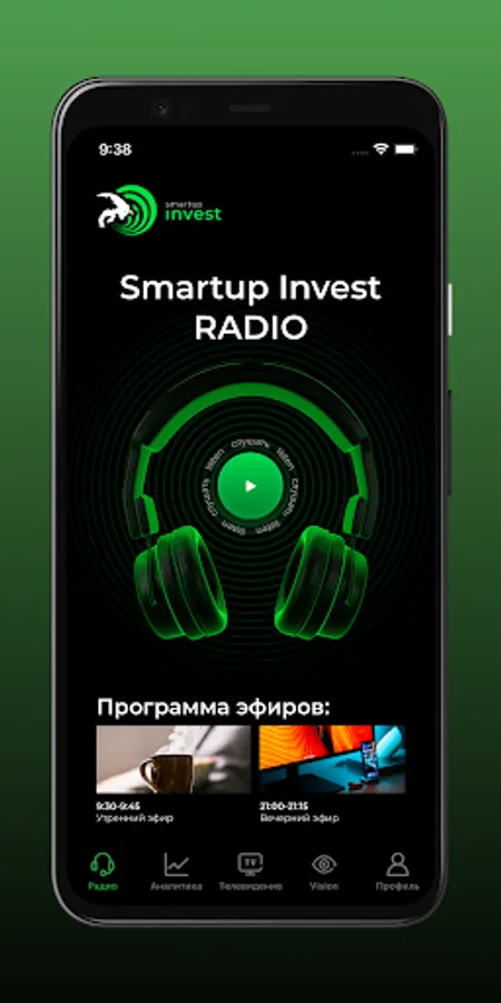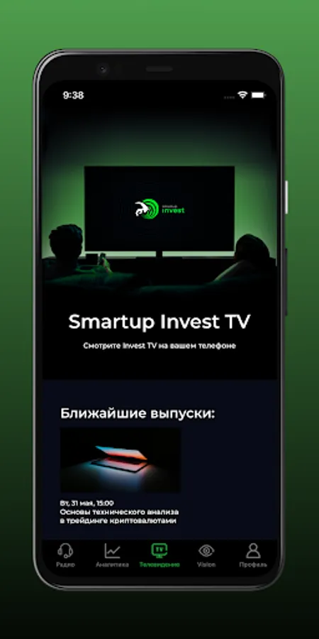 Mobile application for the Smartup Invest investment club ecosystem. Listen to the radio, watch TV about investments, receive signals and education from the world's best traders, as well as from the Vision analytical service.